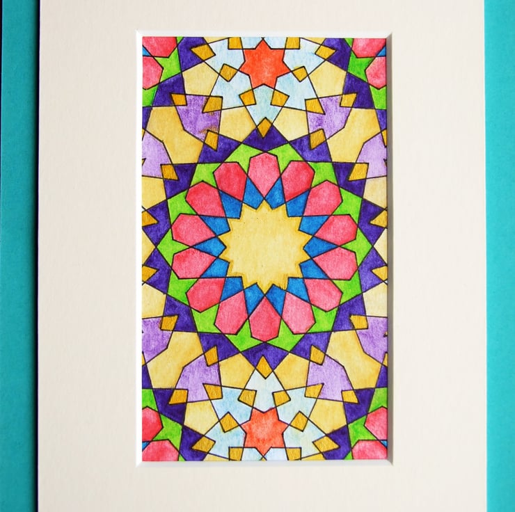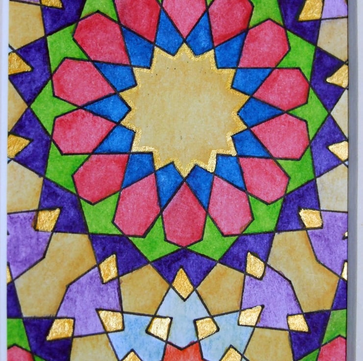Bright and colourful painting in Arabic geometric style. Painted on 250gsm watercolour paper with Derwent Inktense coloured pencils which are solid ink in pencil form, activated with water, resulting in gorgeous vivid colours. The design has been given extra sparkle with metallic gold paint.