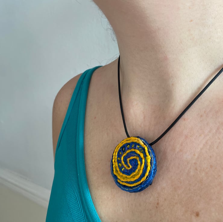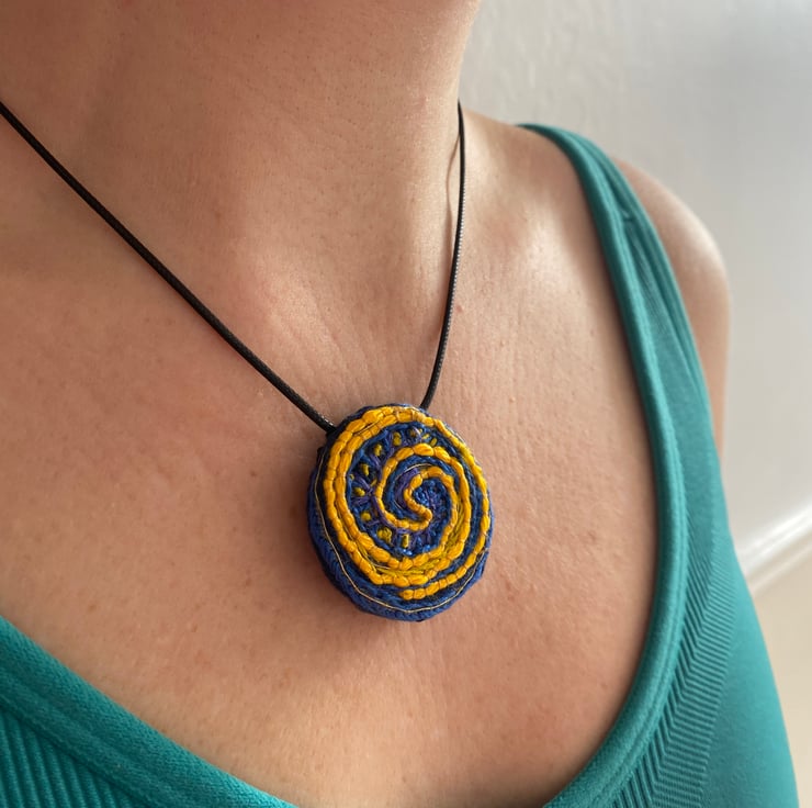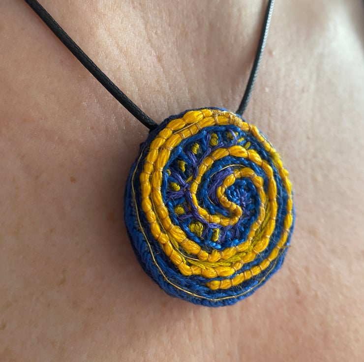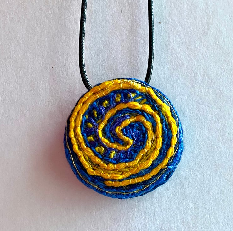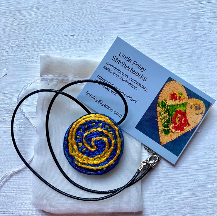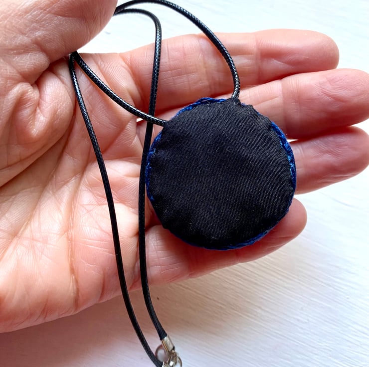 Completely hand stitched, a one off, unique design. The embroidered fabric has been stretched around a repurposed plastic disc and fabric is securely stitched over the back.