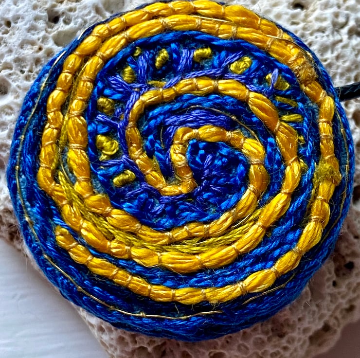 Swirling blue and yellow threads with couched gold coloured wire, have been used to create this lively abstract design.