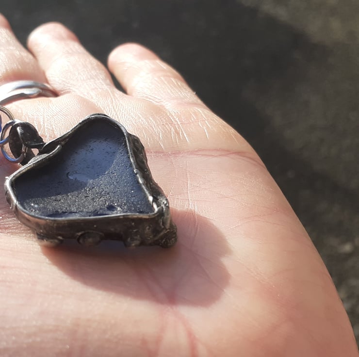Small blue sun catcher, made from a heart-shaped piece of sea glass. I used Tiffany/soft soldering technique to make a bezel for it, then added a few more bits and it was all ready to catch those sun rays!