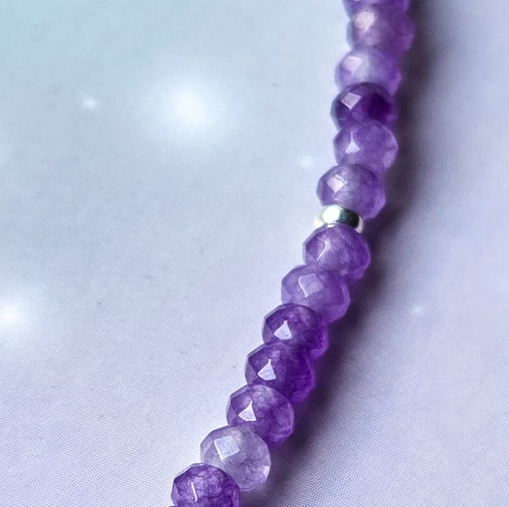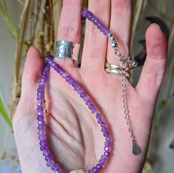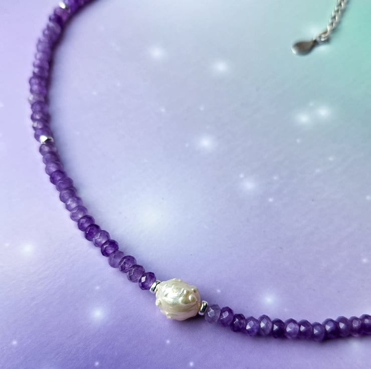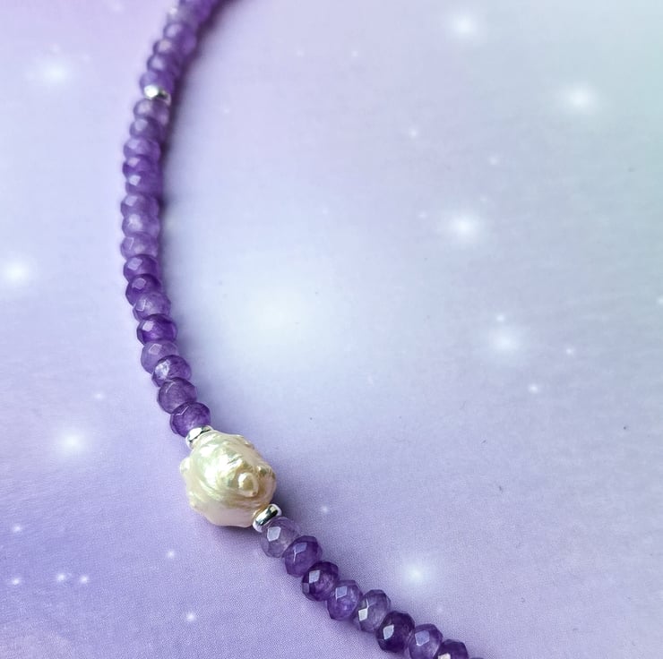 I’ve made this piece with deep purple 3mm faceted Amethyst gemstone beads and a beautiful rosebud freshwater ivory baroque pearl at the centre.
