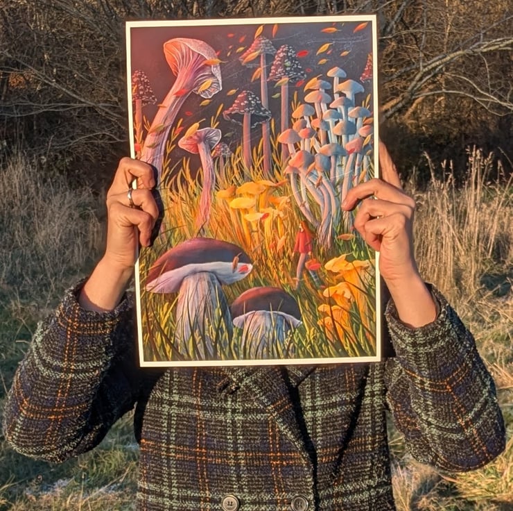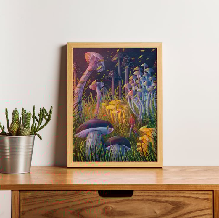 "Mushroom Hunt" is a charming print for anyone who loves the magic of fungi (myself included!). Set in a whimsical scene of lush, overgrown mushrooms, this piece brings a touch of enchantment and mystery to any space.