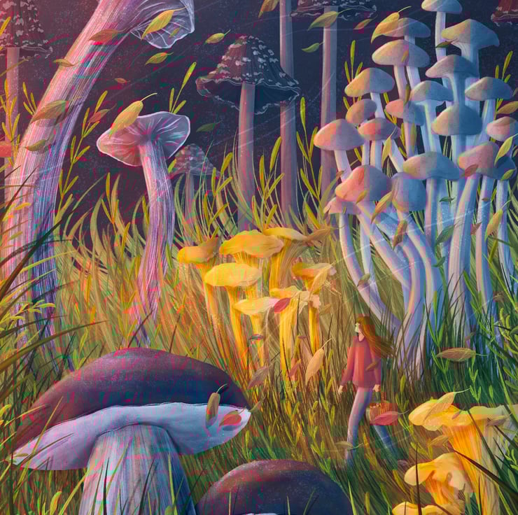 This illustration is inspired by my childhood love for the outdoors and the joy of mushroom picking. The unique shapes and magical qualities of fungi have always fascinated me, and with this piece, I wanted to capture that wonder.