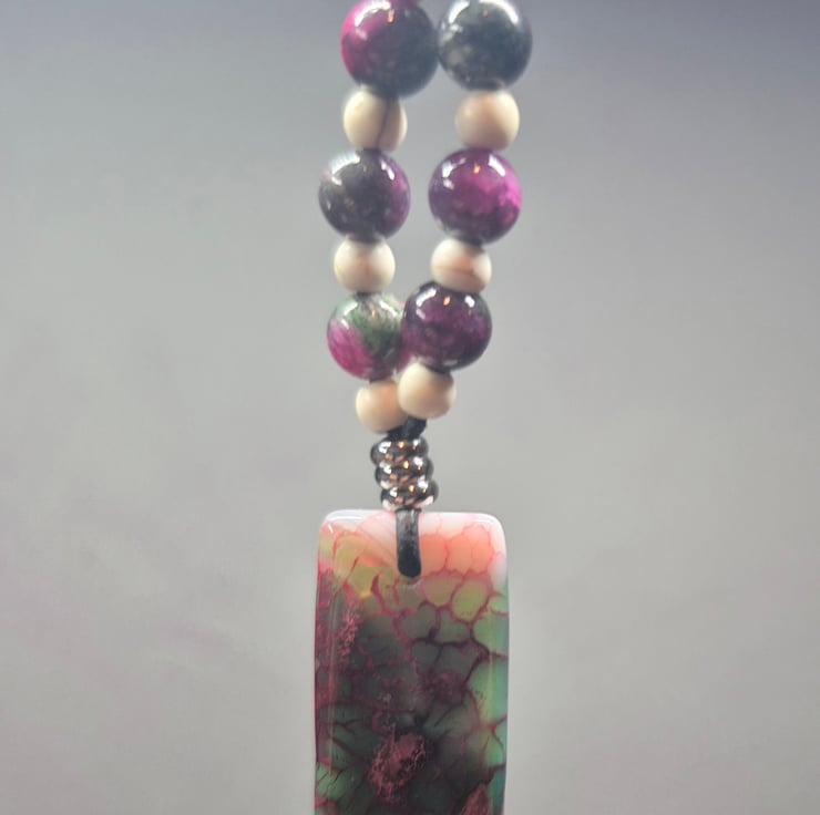 Red and green dragon veins oblong pendant on black leather cord with matching beads, howlite spacers and stainless steel connector and slider.