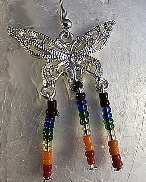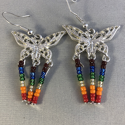A lovely little pair of earrings with a butterfly on top of two dropped Pride Flag colours in beads coming from the bottom of them.