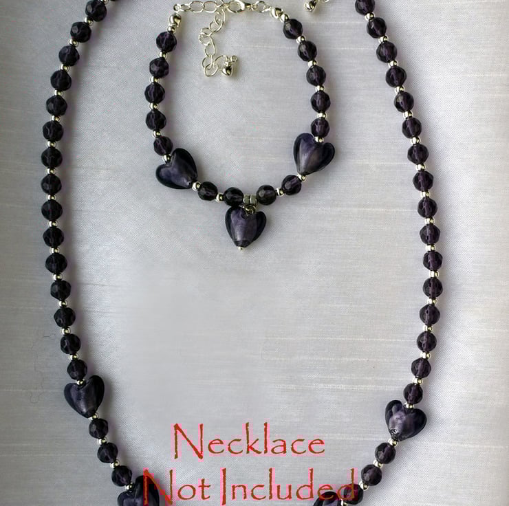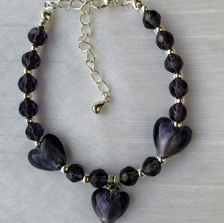 This unique handmade bracelet features three beautiful dark purple lampwork glass hearts, complimented with faceted glass beads of a similar colour, and interspersed with silver plated spacer beads. The findings/fittings are also silver plated. The central heart hangs just below the beads as a pendant.