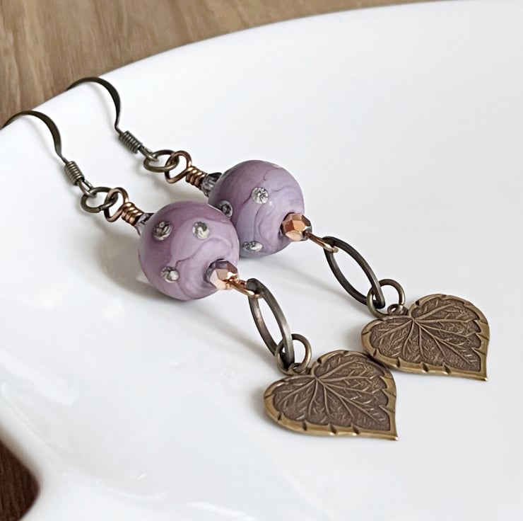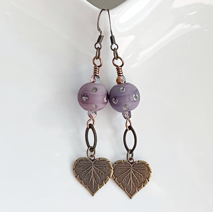 Hanging below the glass beads via bronze cats eye connector are dainty heart shaped leaves that have an embossed leaf pattern on them.