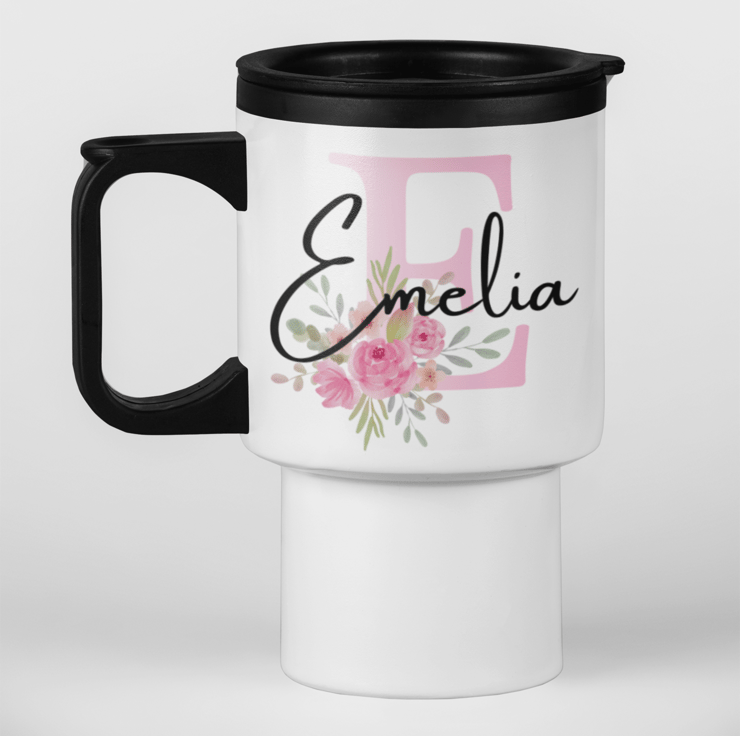 Personalised Pink Floral Initial and Name Travel Mug Personalised Gift