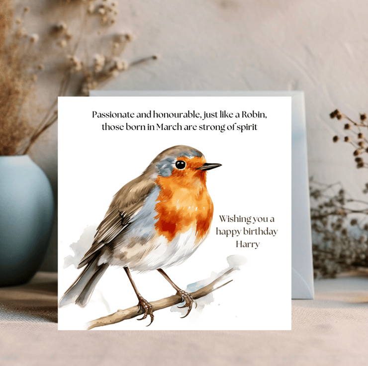 Robin Watercolour printed greetings card for a March Birthday
