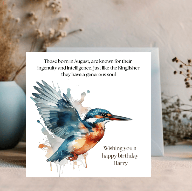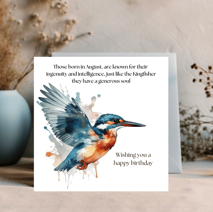 Kingfisher Watercolour printed greetings card for a August Birthday