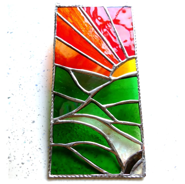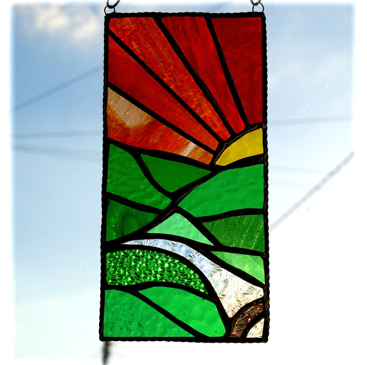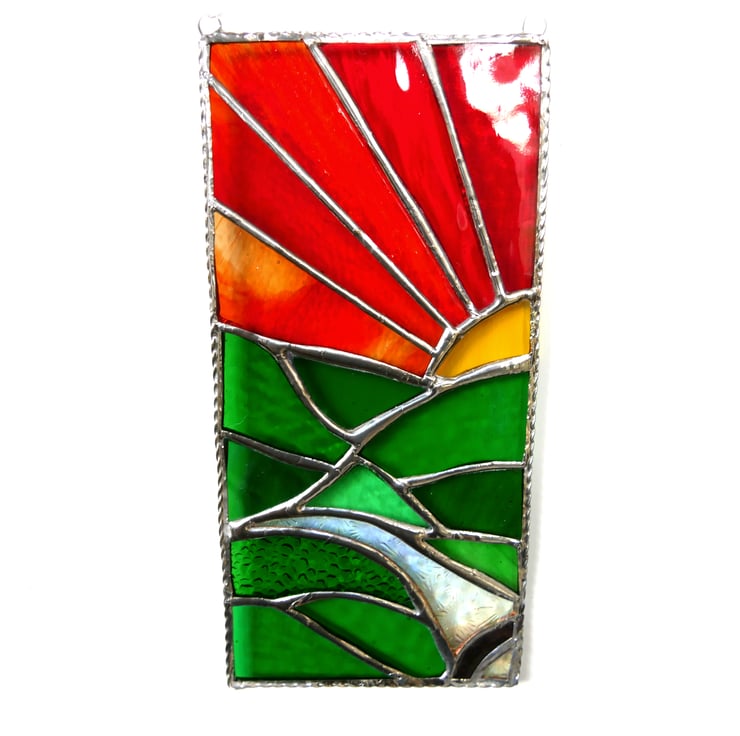 This stained glass picture is 4 x 8.5 inches. Designed to hang as a suncatcher in the window , it is framed' it for strength with twisted wire.