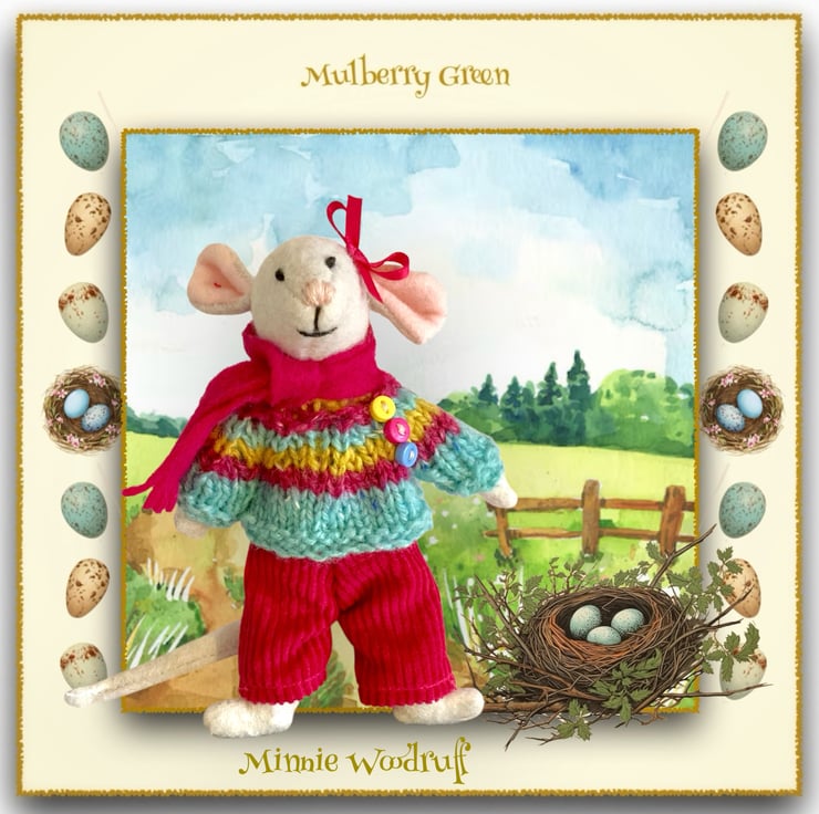 Minnie Woodruff, all ready to go out to play in the woods in her raspberry pink corduroy trousers, striped jumper and matching scarf, is a Pip Squeak - a young Little Nipper. Little Nippers are tiny wood mice who live in a maze of tunnels underneath the barn at Mulberry Farm. All of the Little Nippers are named after herbs and meadow flowers. Pip Squeaks are 11cm tall. Clothes made especially to fit them are also available in my shop.