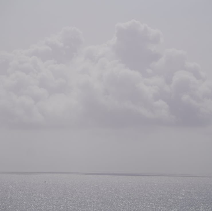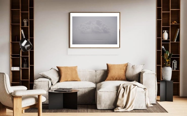 SIgned, limited edition photographic art print of white clouds above a misty sea.