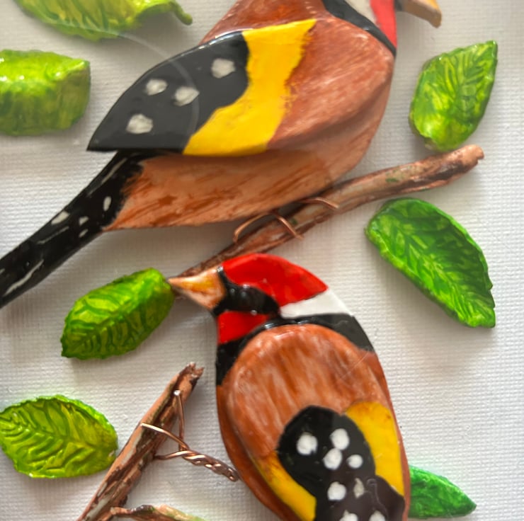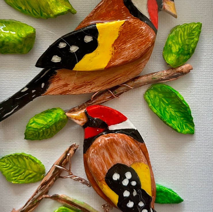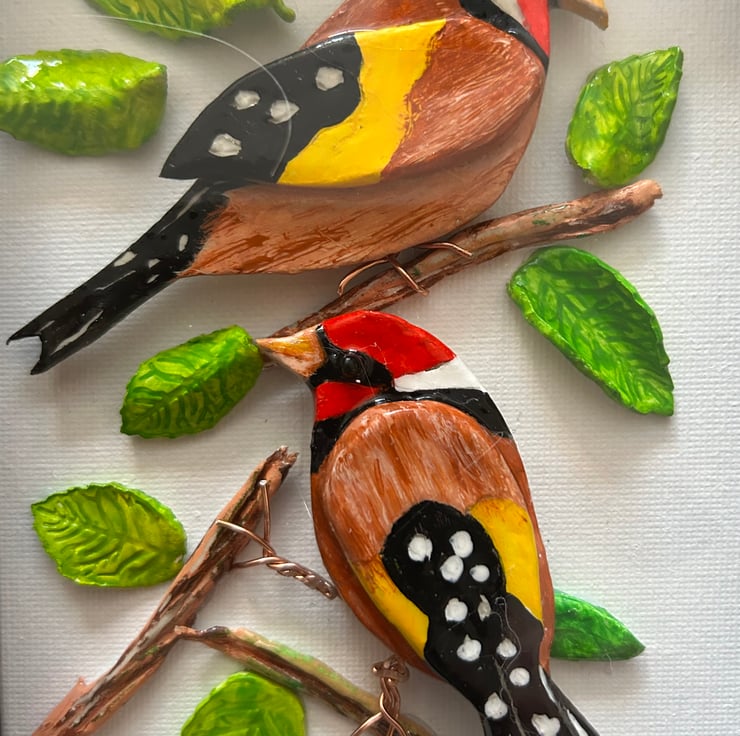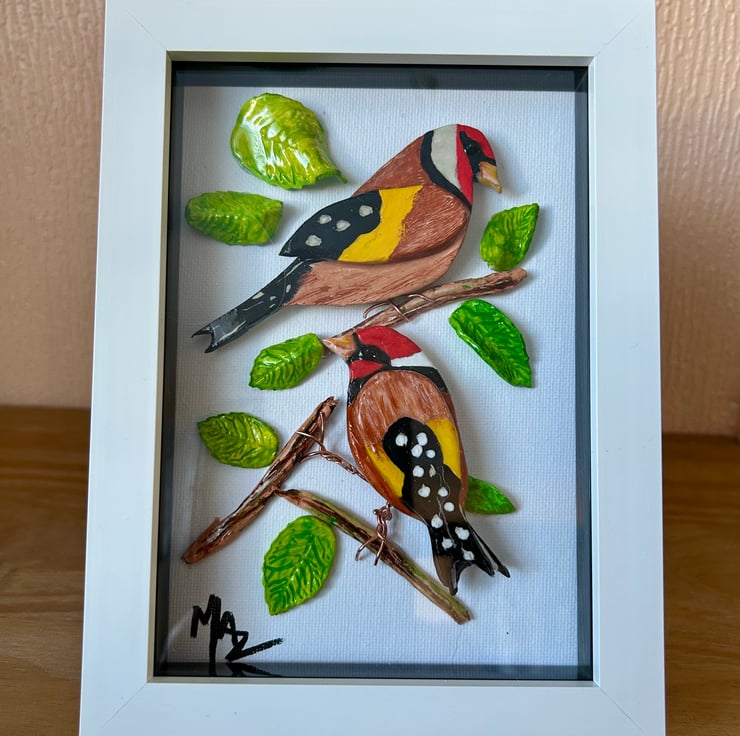This clay art of a pair of goldfinches framed in deep box frame behind glass makes a perfect gift for bird lovers or excellent piece of unique home decor art that can be wall hung or free standing canvas size is 15x20 cm overall size of framed art is 24x17x3 cm