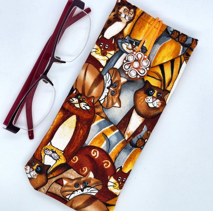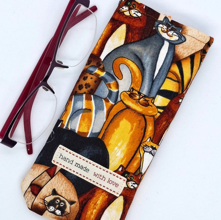 It is wadded to protect your glasses and features a hand made with love label on the back. The lining is in burnt orange cotton and it has a sparkly orange colour button reflecting the fabric colours and a loop closure to keep your glasses secure.