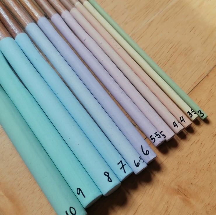 The wooden hooks are sizes: 3.0mm, 3.5mm, 4.0mm, 4.5mm, 5.0mm, 5.5mm, 6.0mm, 6.5mm, 7.0mm, 8.0mm, 9.0mm and 10.0mm