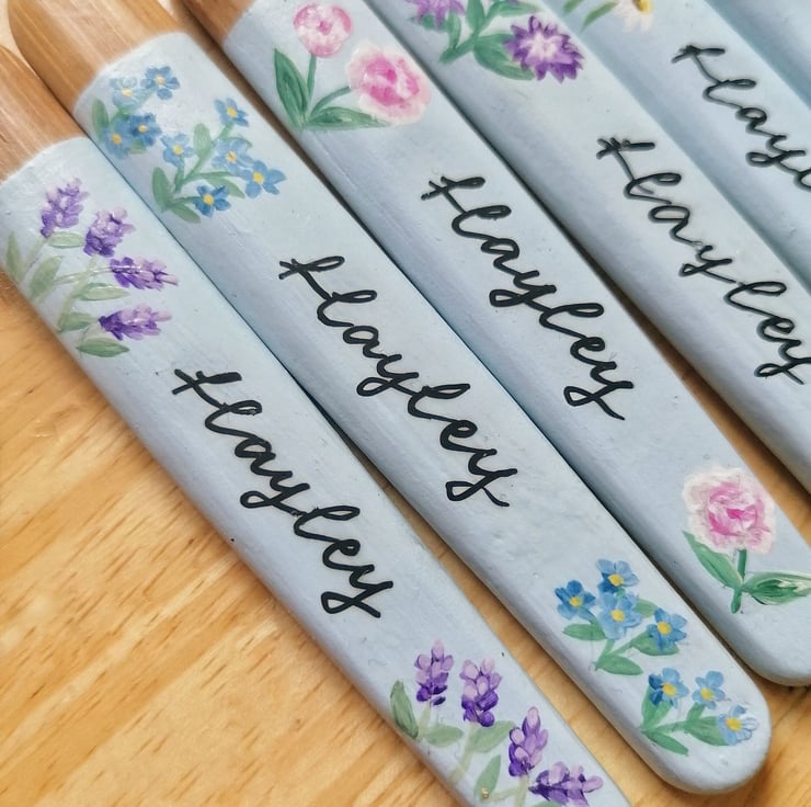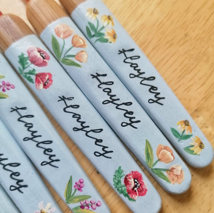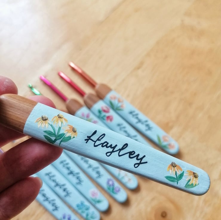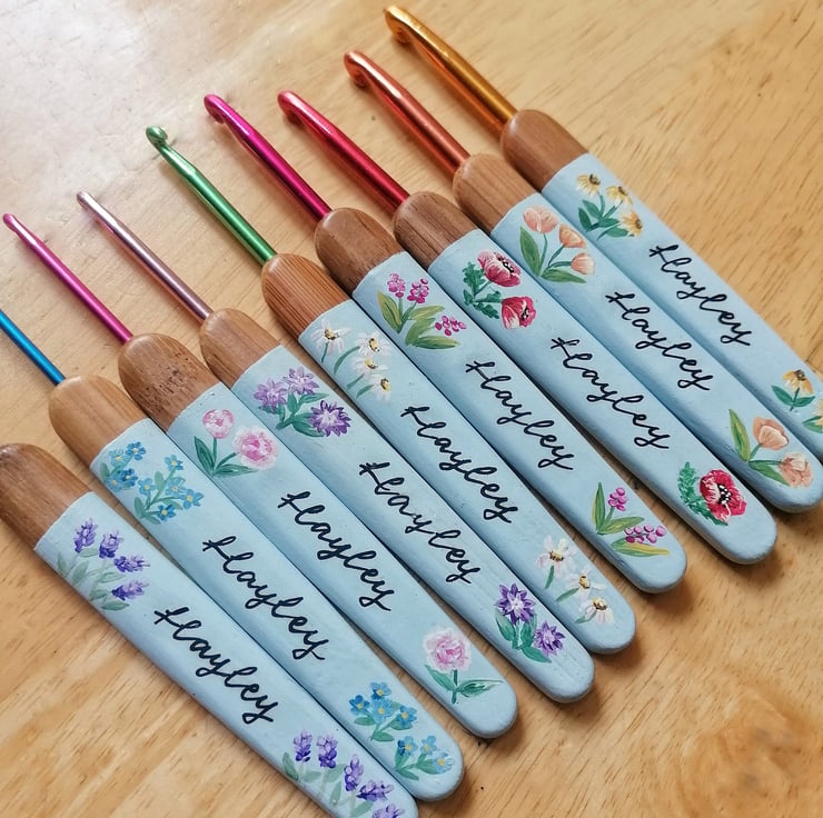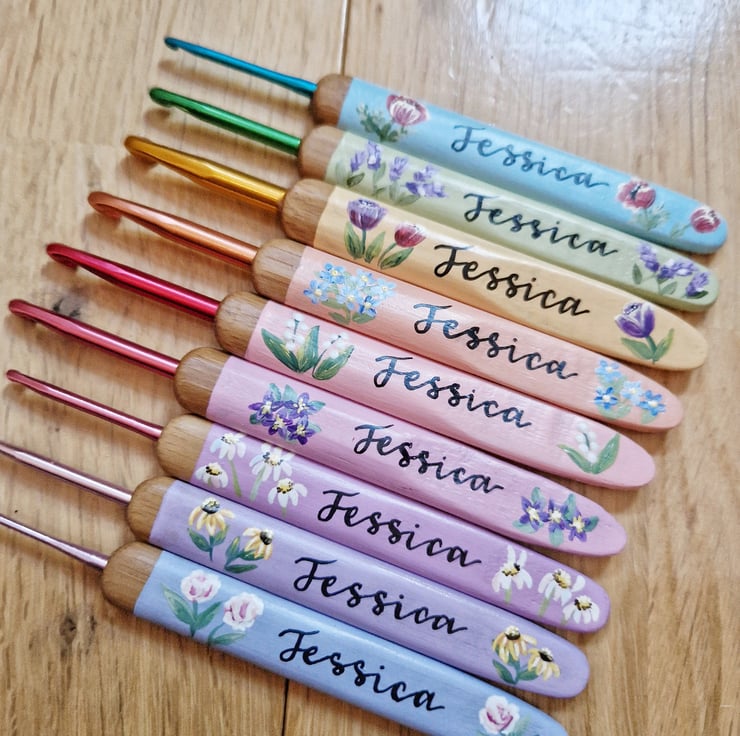 A gorgeous painted personalised crochet hook set of 9 different sizes.