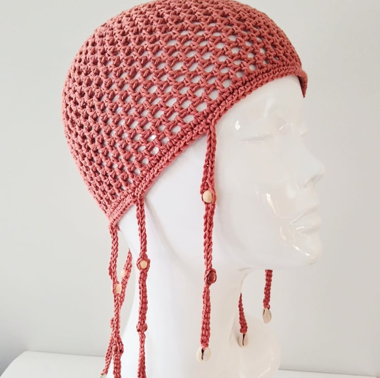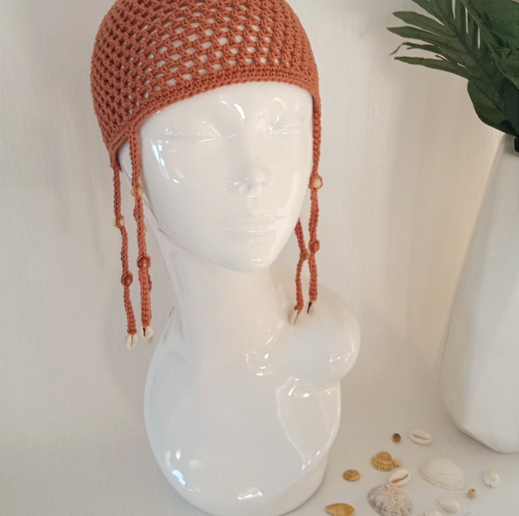 This russet orange mesh skull cap has a cool beach feel to dress up your holiday and festival outfits.