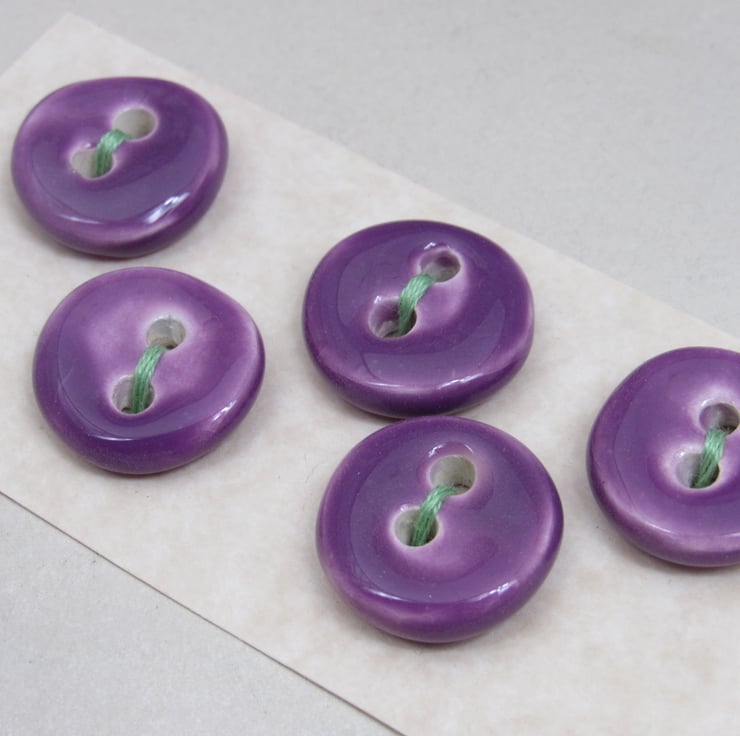 5 small stoneware buttons finished with a pretty lilac purple glaze