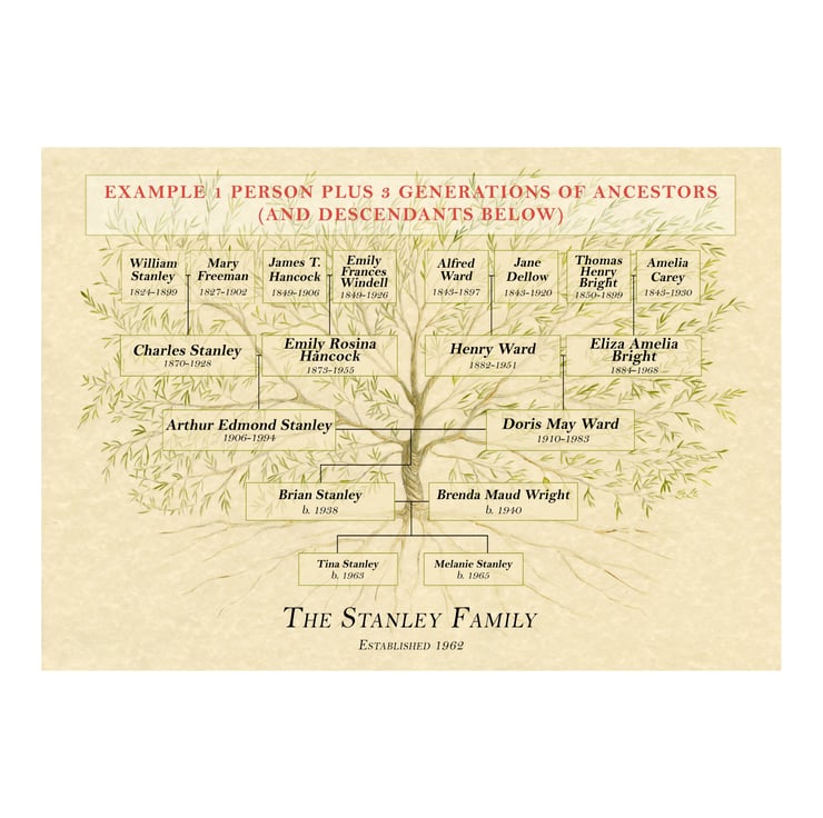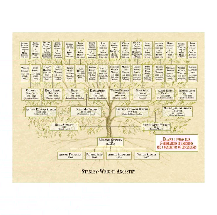 Create a unique custom family tree chart, totally flexible, it does not have include only the direct line of ancestors and/or descendants. We can add siblings of each generation too. Add as much detail as you like. Dates of birth, death and marriage, place names too. The chart will be created to fit to your family.