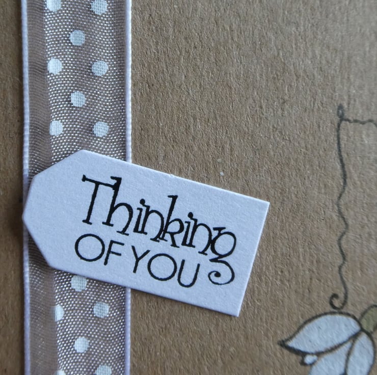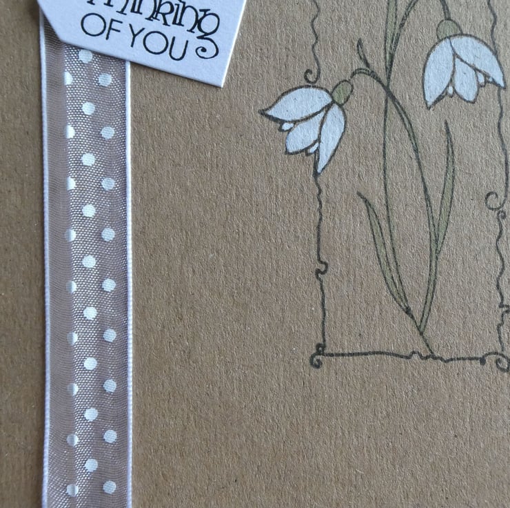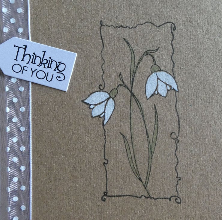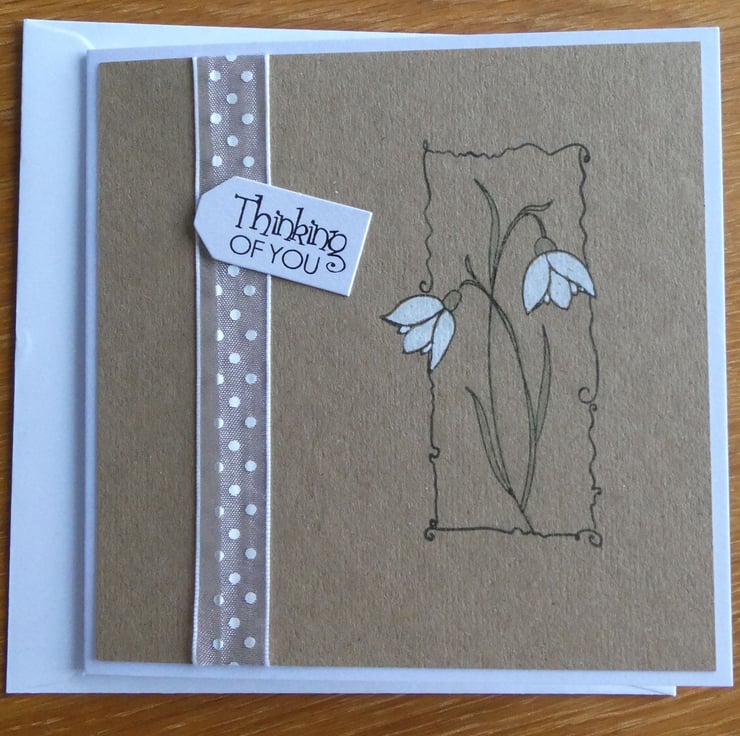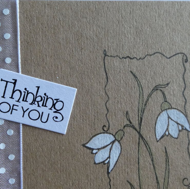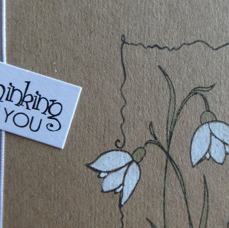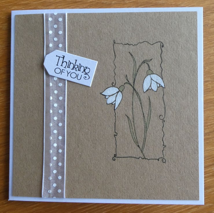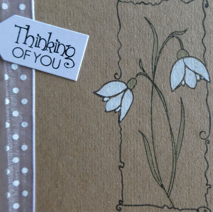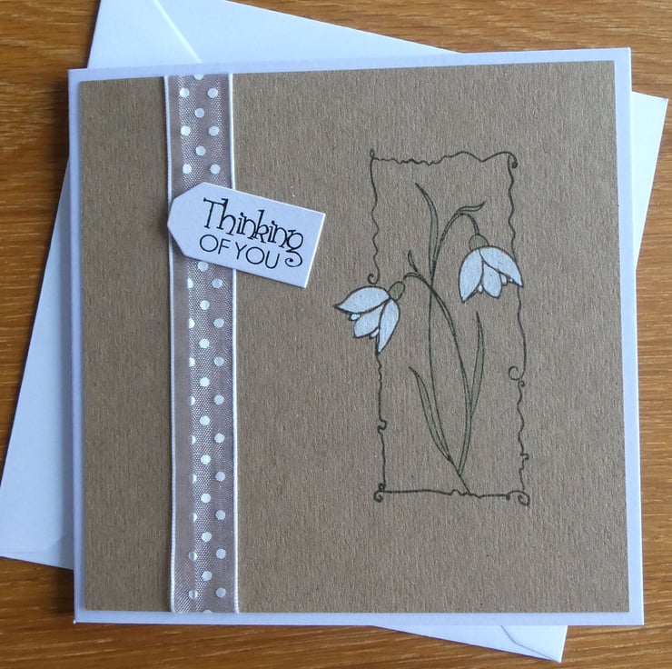 With the message Thinking of You this card has an image of delicate snowdrops hand stamped and coloured on a base of recycled kraft card making it ideal for a sympathy or get well card, as well as just to let someone know that they are in your thoughts.
