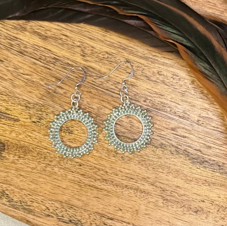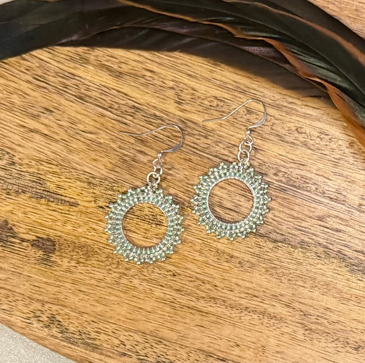 The beads have been hand-woven onto silver tone hoops in a circular pattern starting with a row of silver beads, then pale green beads and finally the last row forms a 3 bead edging pattern.