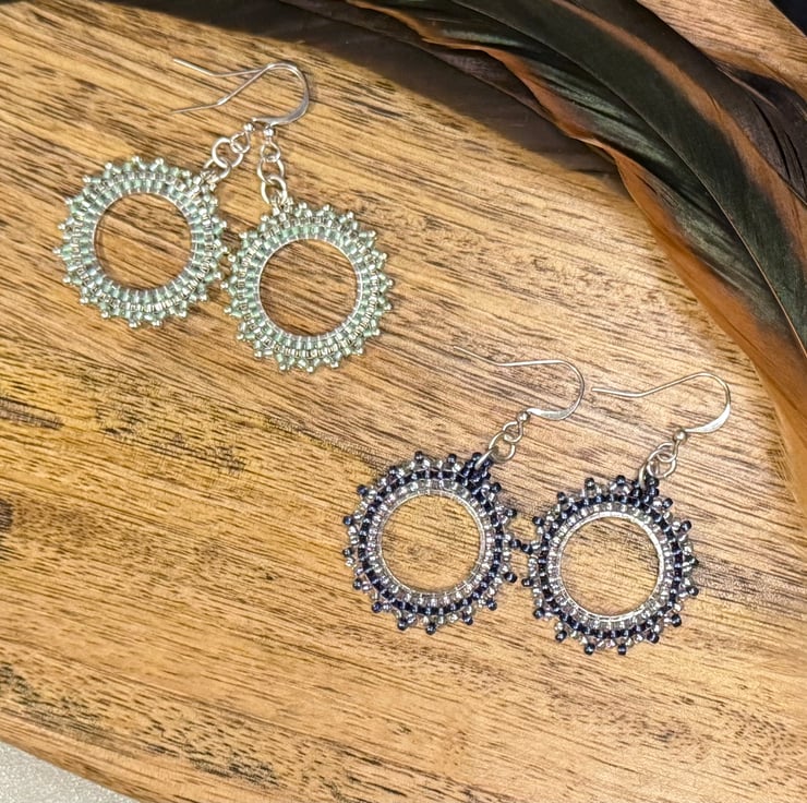The beadwork hoops dangle from silver tone ear wires and these earrings have a drop of 5cm and are 3.5 cm wide.