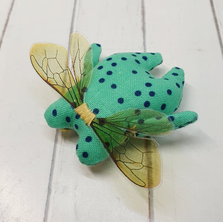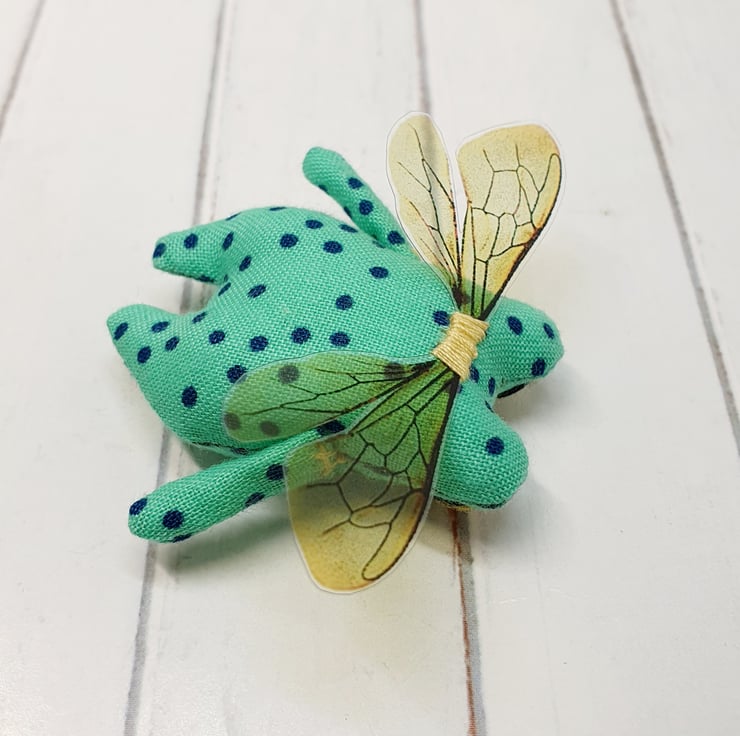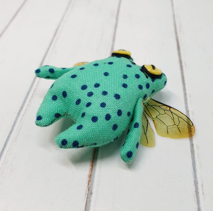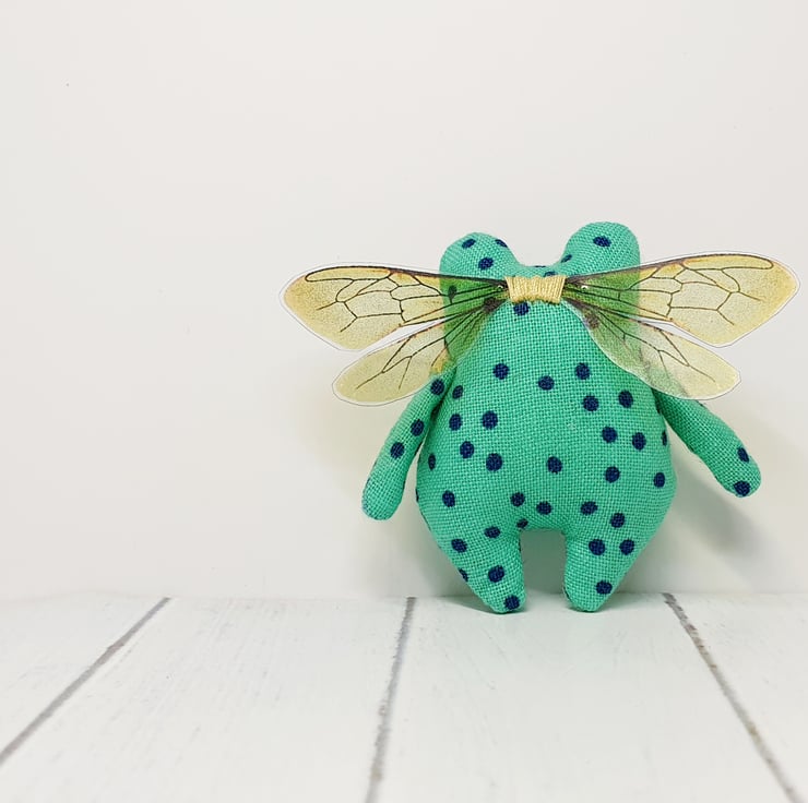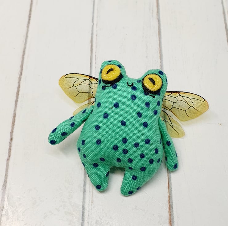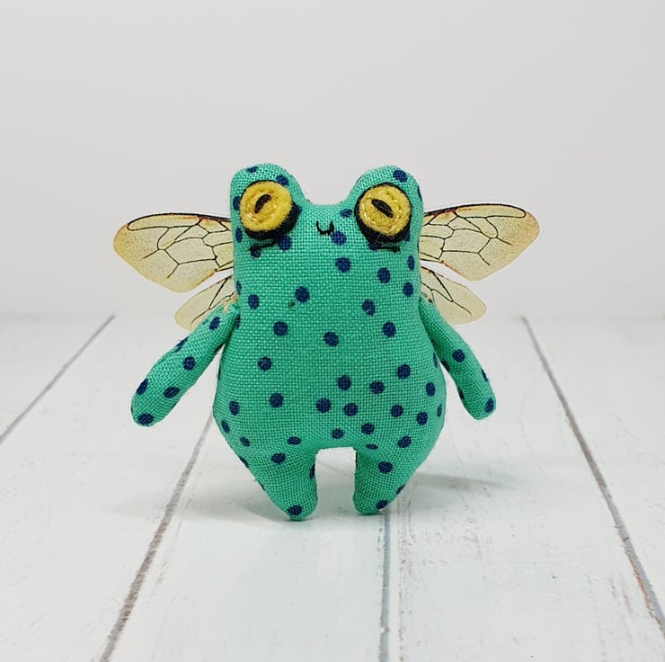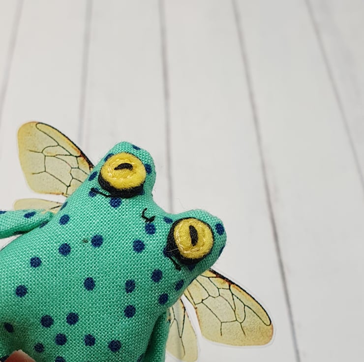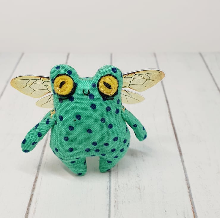 Cotton stuffed miniature art doll with free motion embroidered and hand embroidered eyes. This froggy has felt eyes and hand cut printed plastic wings sewn into place. Froggyfly measures roughly 5.5cm tall with a 6.5cm wingspan. Comes with transparent loop hanger. This art doll is for decorative purposes only and not a toy. Sent in recyclable or recycled packaging wherever possible. If you'd like your order tacked please also add tracking to your basket. Tracking information given upon request.
