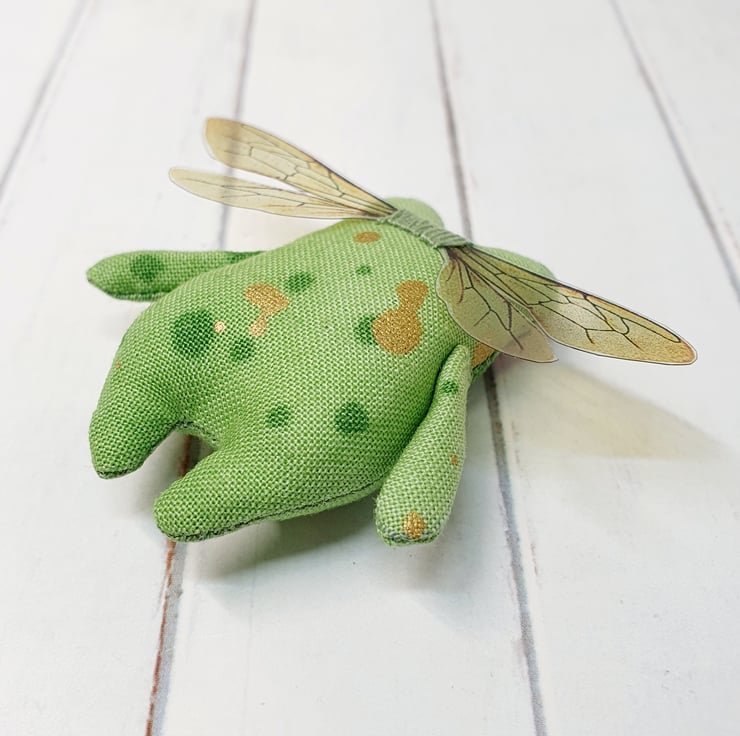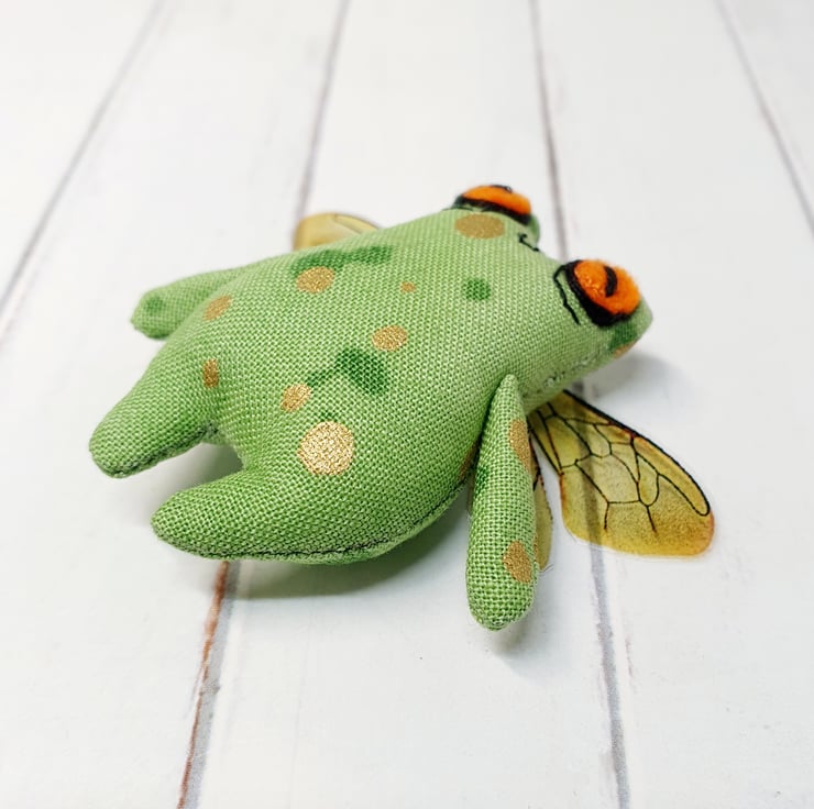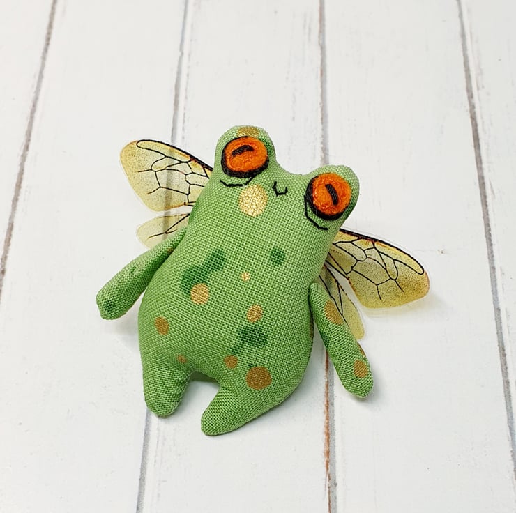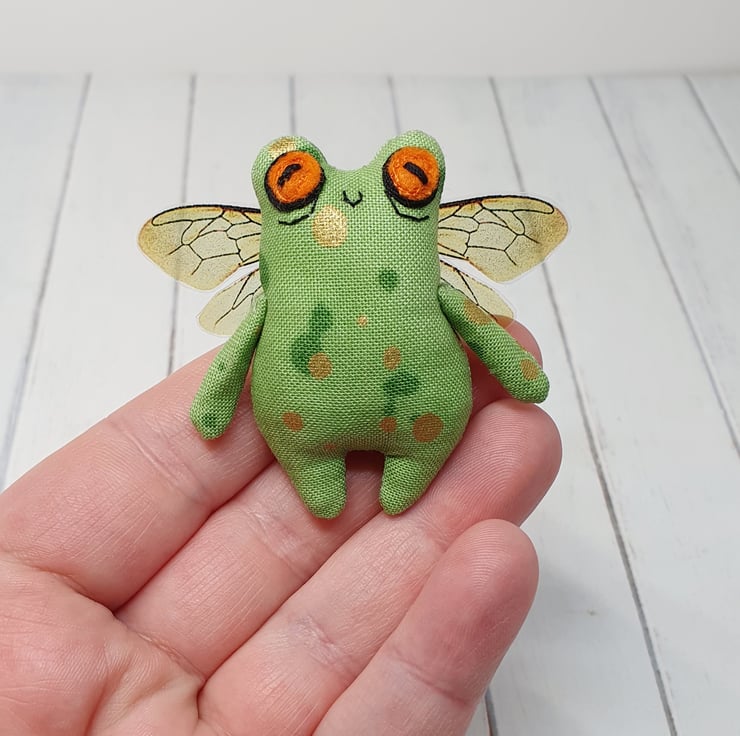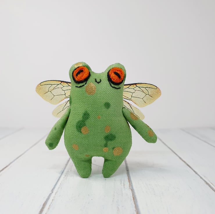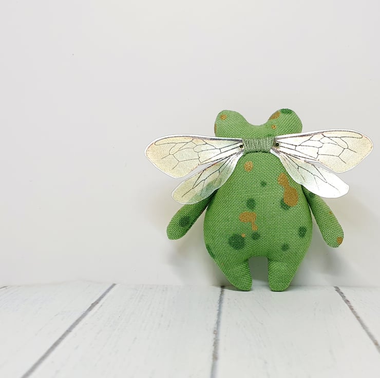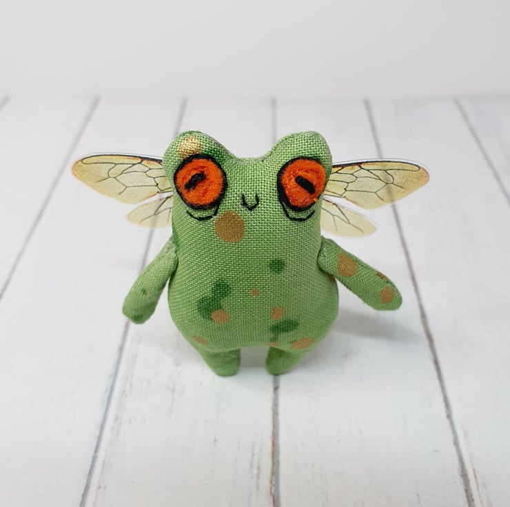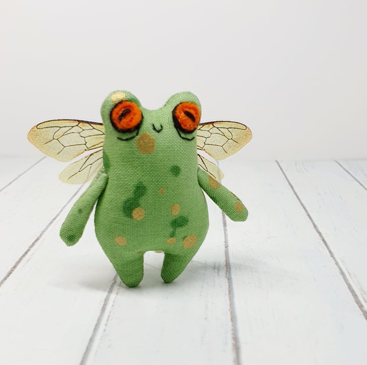 Cotton stuffed miniature art doll with free motion embroidered and hand embroidered eyes. This froggy has felt eyes and hand cut printed plastic wings sewn into place. Froggyfly measures roughly 5.5cm tall with a 6.5cm wingspan. Comes with transparent loop hanger. This art doll is for decorative purposes only and not a toy. Sent in recyclable or recycled packaging wherever possible. If you'd like your order tacked please also add tracking to your basket. Tracking information given upon request.