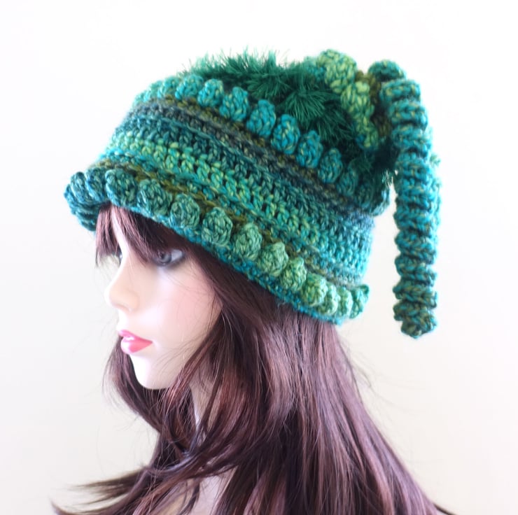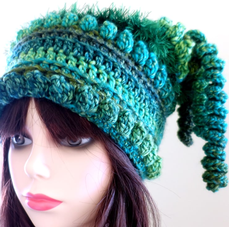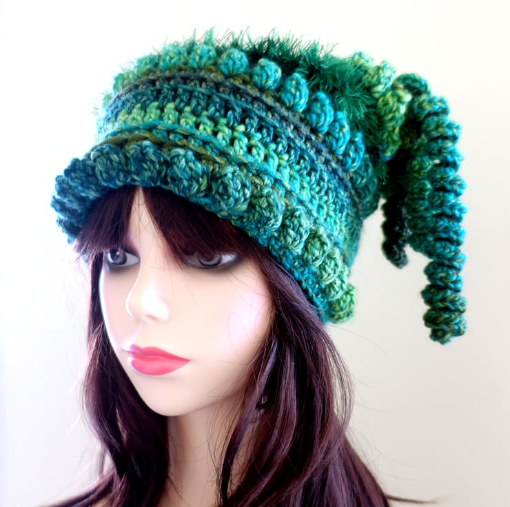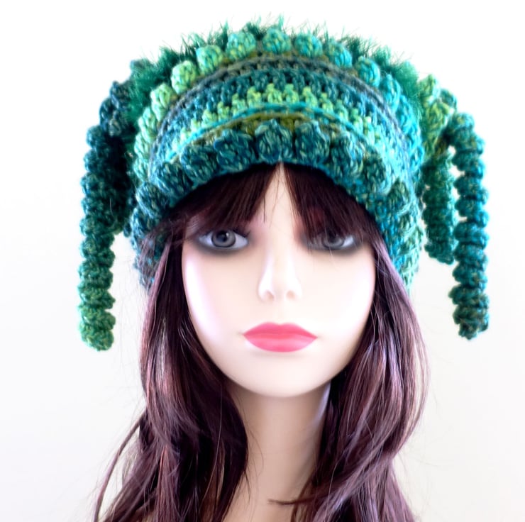Emerald Green Crochet Festival Beanie Hat. Fun and Quirky Gift.
