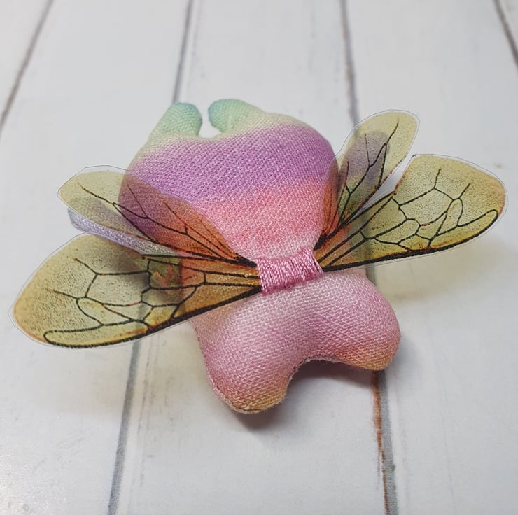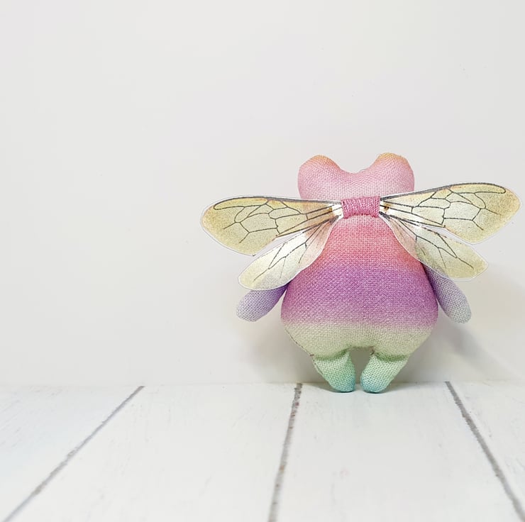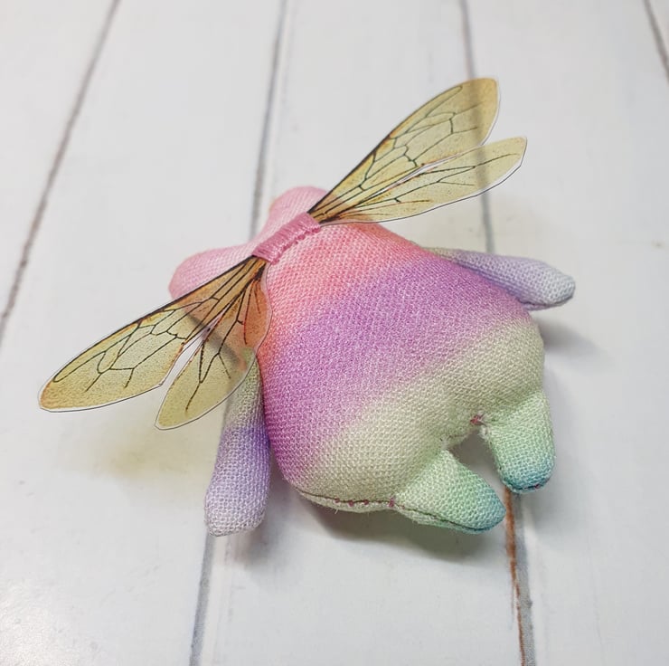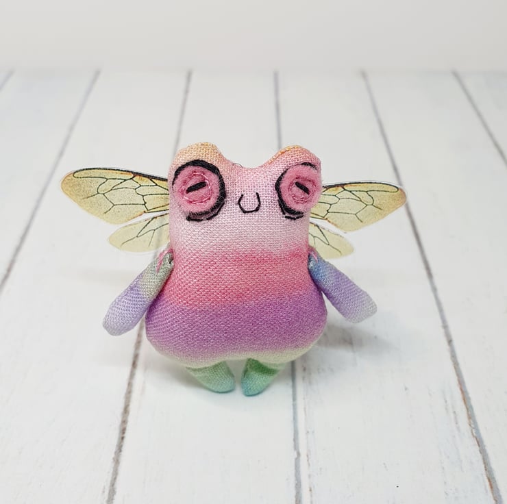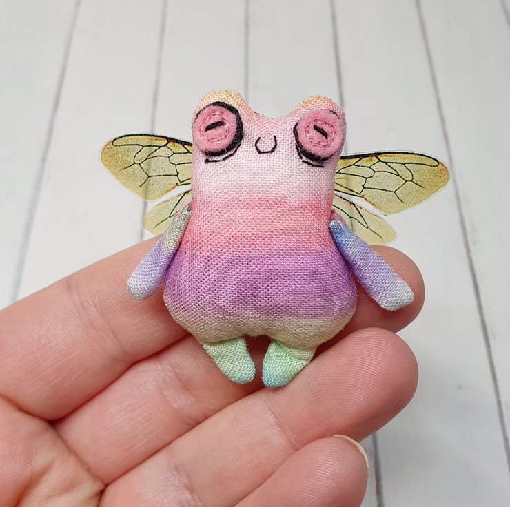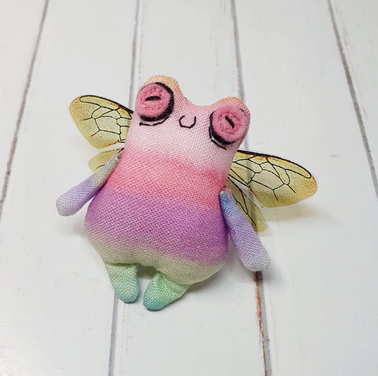 Cotton stuffed miniature art doll with free motion embroidered and hand embroidered eyes. This froggy has felt eyes and hand cut printed plastic wings sewn into place. Froggyfly measures roughly 5.5cm tall with a 6.5cm wingspan. Comes with transparent loop hanger. This art doll is for decorative purposes only and not a toy. Sent in recyclable or recycled packaging wherever possible. If you'd like your order tacked please also add tracking to your basket. Tracking information given upon request.
