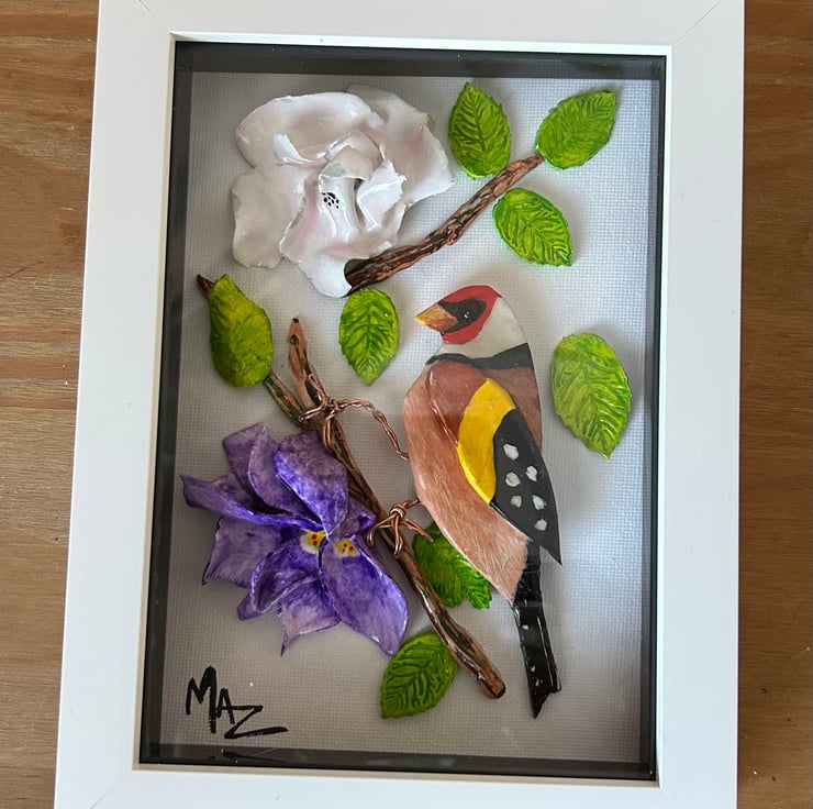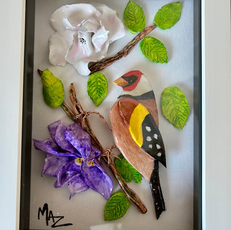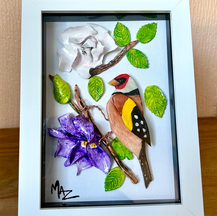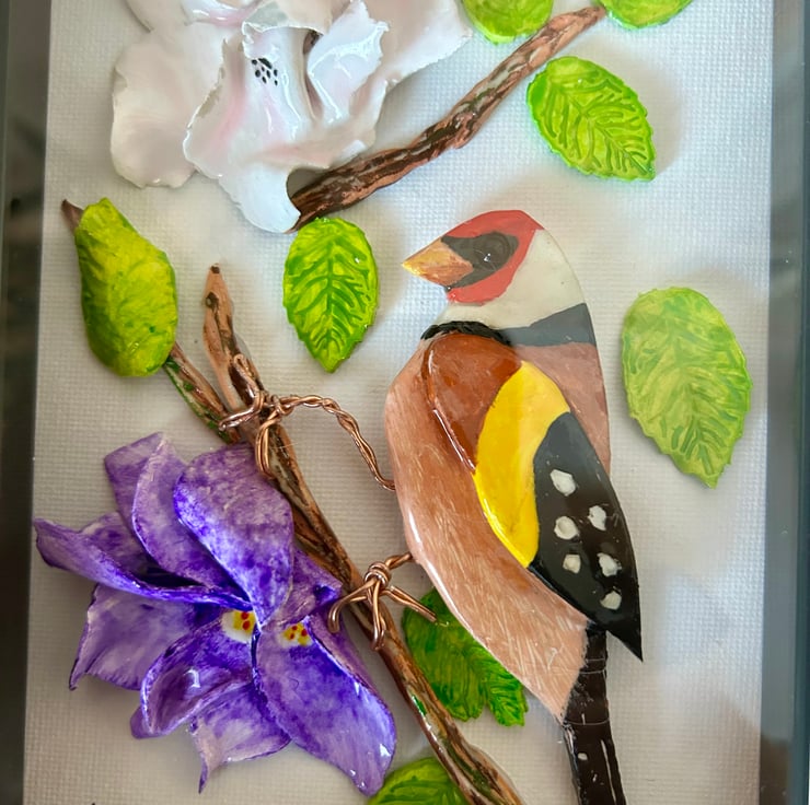 Perfect unique gift for bird lovers created from clay and painted before coating in a clear resin. leaves and flowers are also crafted from clay all framed in a deep box frame with glass that can be wall hung or