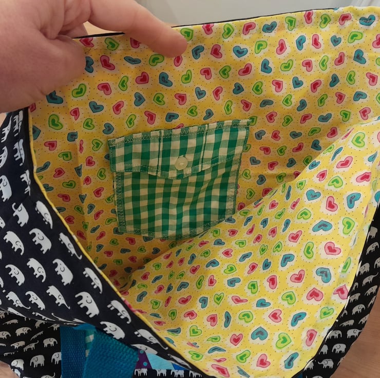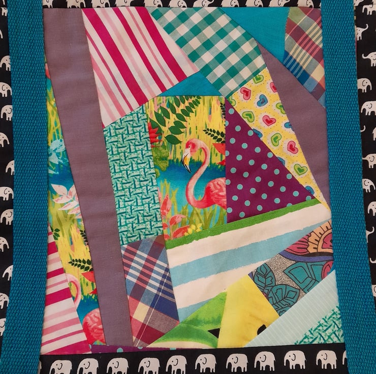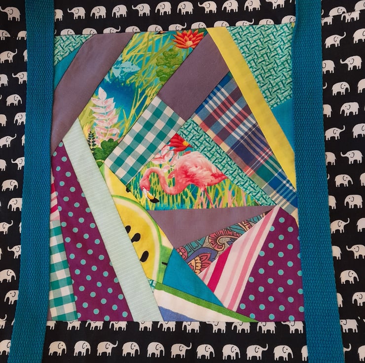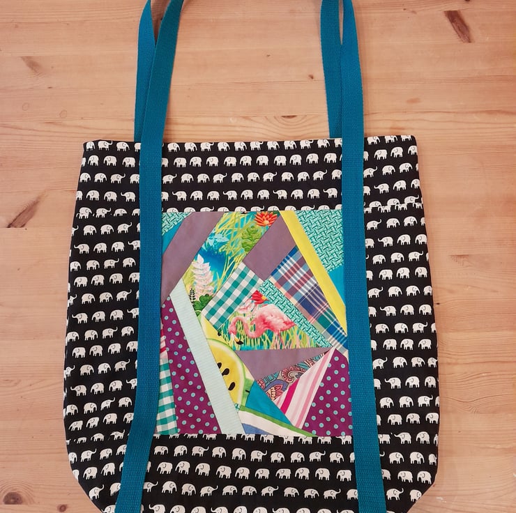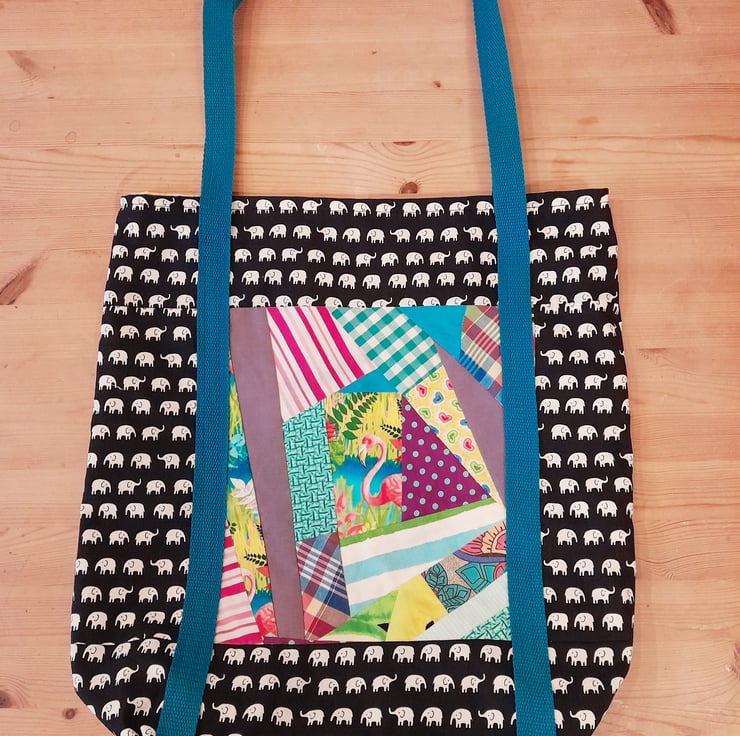 A contrasting black and white elephant print border complements the vibrant central crazy-patchwork panel and turquoise straps. The high quality cotton straps extend down the length of the bag, giving extra strength. A fun yellow lining is finished with a handy inner pocket for keeping small items safe.