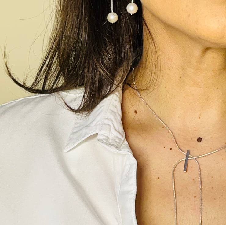 A bar of sleek sterling silver resting elegantly on your ear, from which a series of thin, bendable chains cascades down. With a shimmering freshwater pearl at the end of each chain, this necklace dangles delicately, drawing the eye and the light. Anyone looking to make a sophisticated yet striking statement will love this design, which expertly combines modern geometry with the classic allure of pearls.
