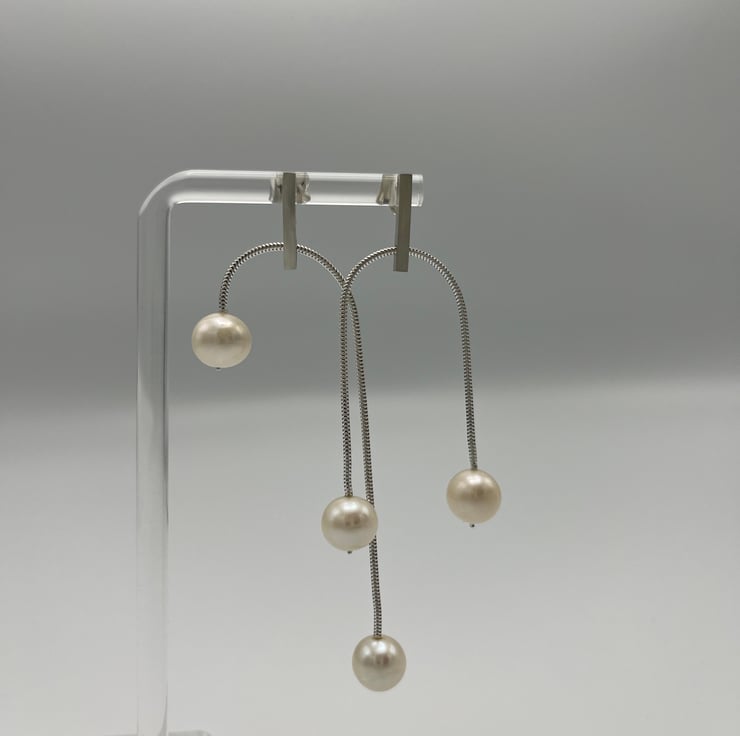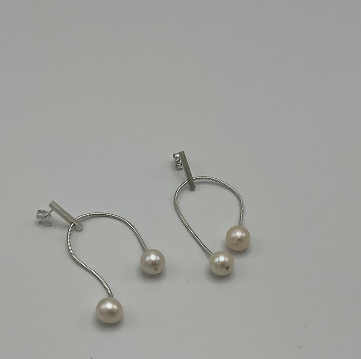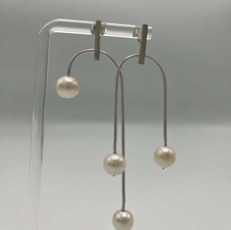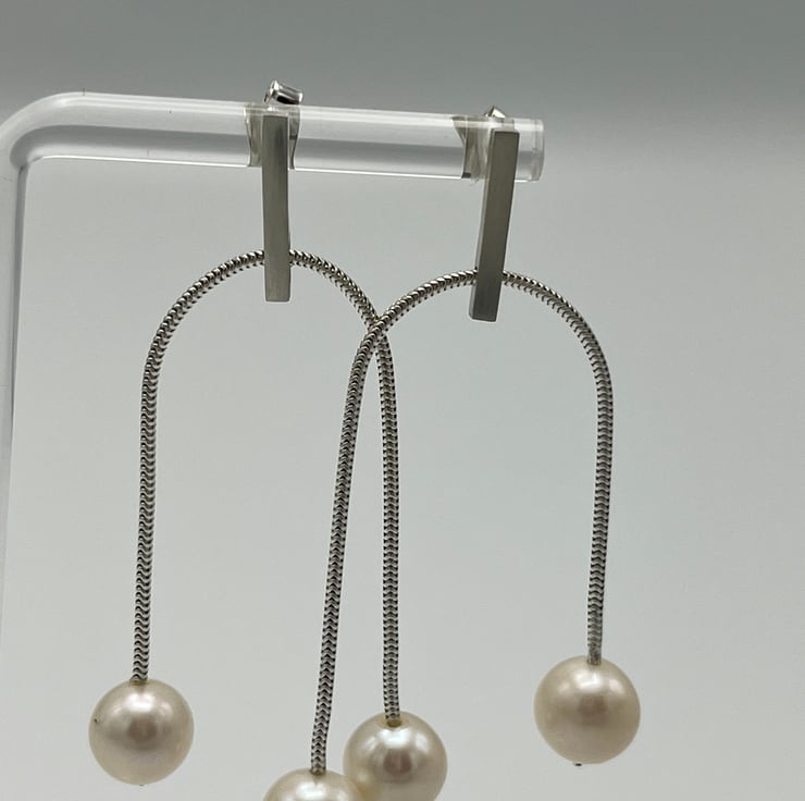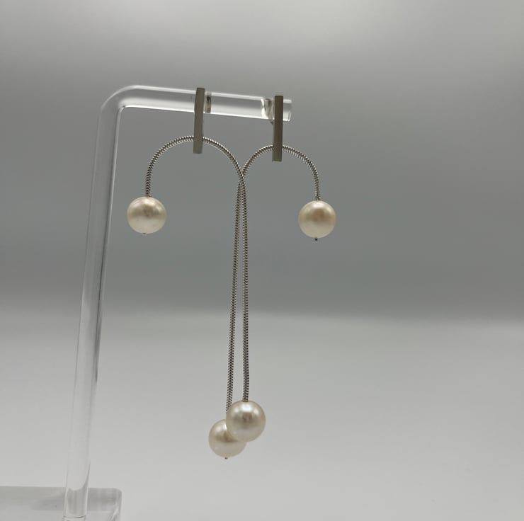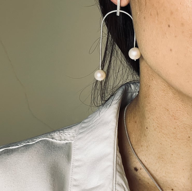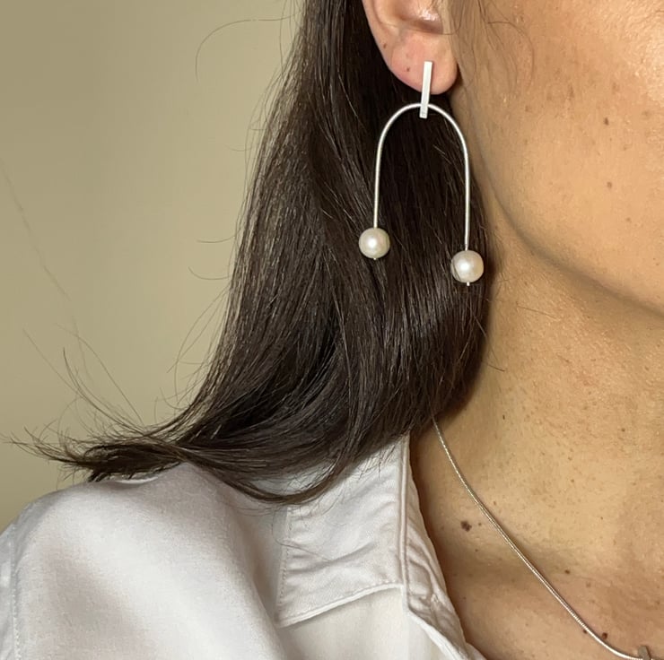 Whether you're dressing for day or night, these silver and pearl earrings will be the perfect accessory. Crafted by hand in a cosy studio, each pair is a testament to quality, comfort, and meticulous attention to detail. These dangles will update any ensemble with a touch of contemporary grace if you like minimalist design with a contemporary spin.