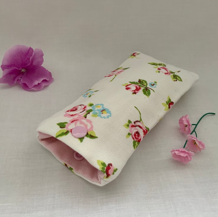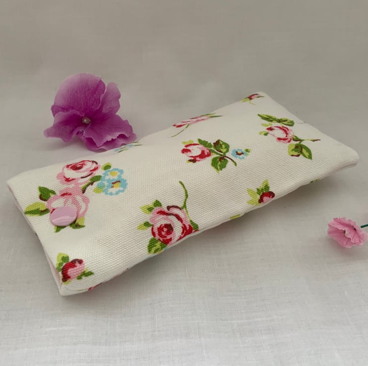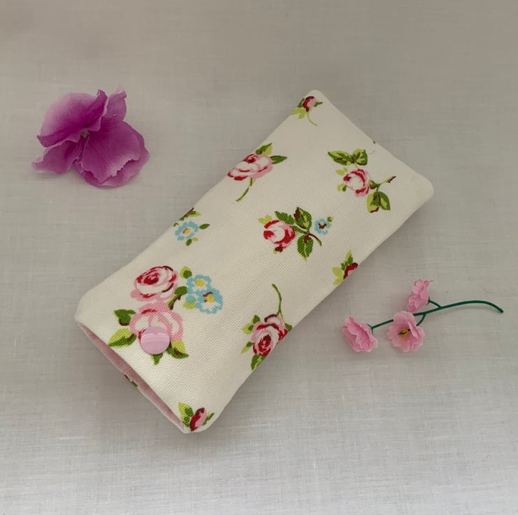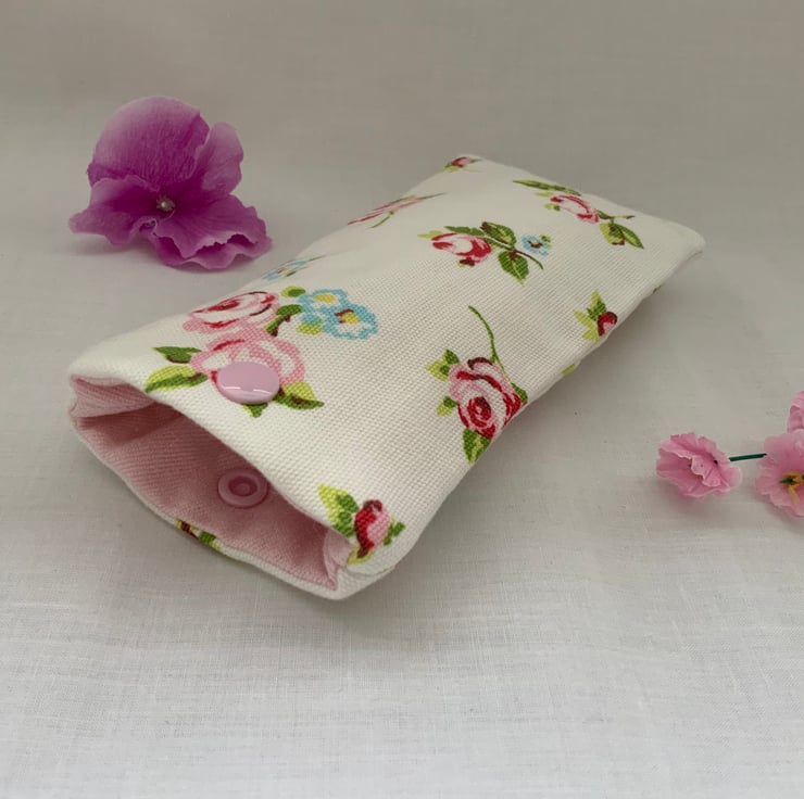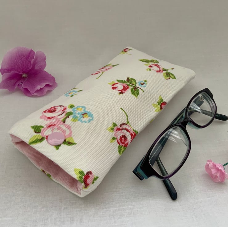 Handmade fabric glasses case / sunglasses case made in a pretty floral fabric. This case is fully lined and lightly padded to give protection to your glasses. It is fitted with a plastic snap fastener to keep your glasses secure.