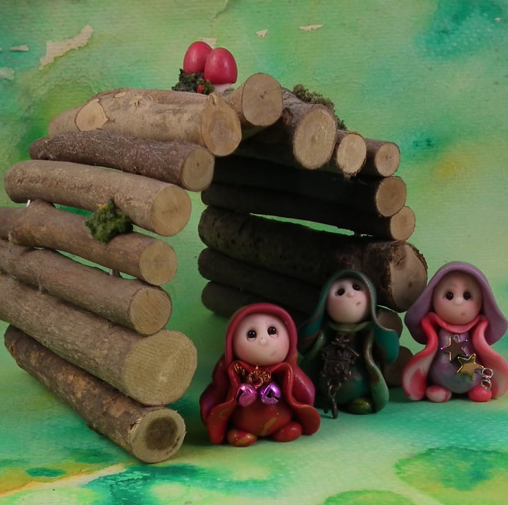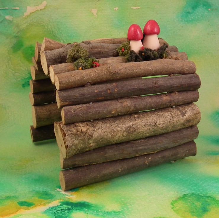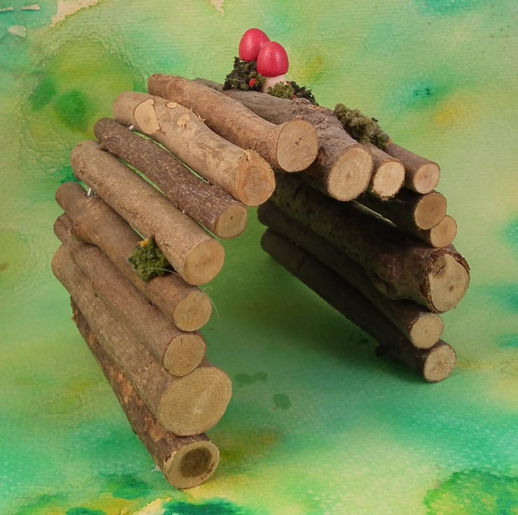 Sale ... A wooden gnome-shelter with toadstools and moss ... three and a half inches high. Gnomes listed separately.
