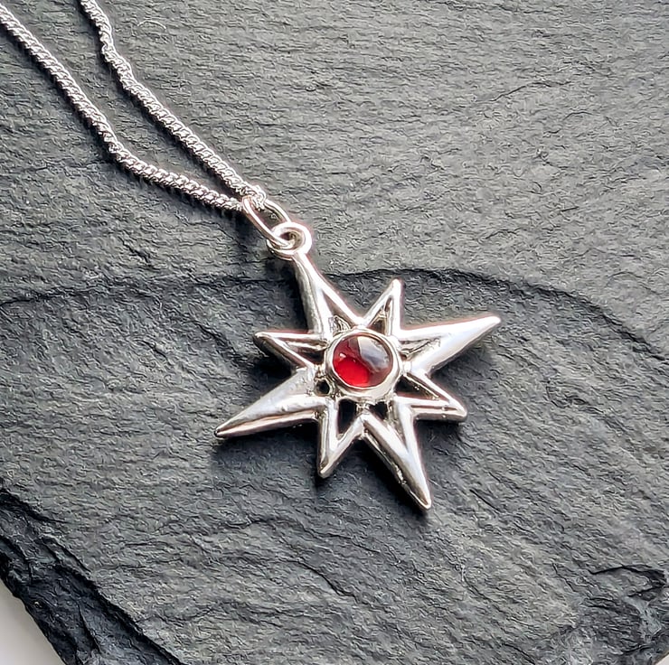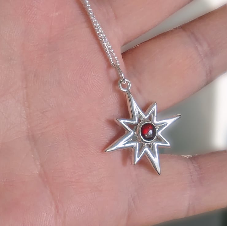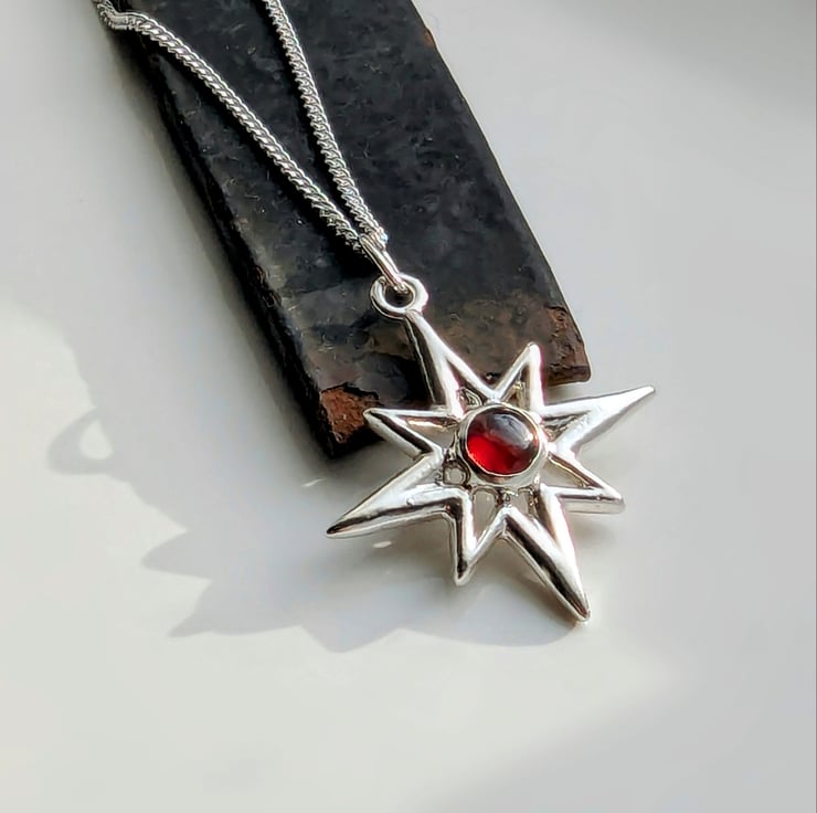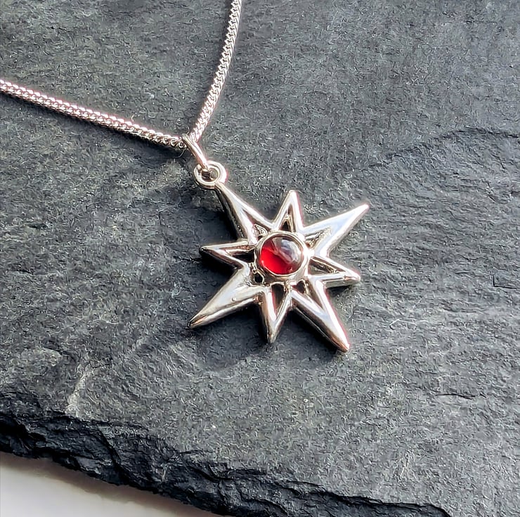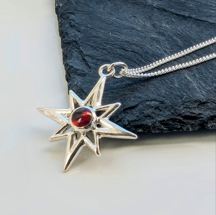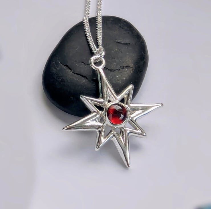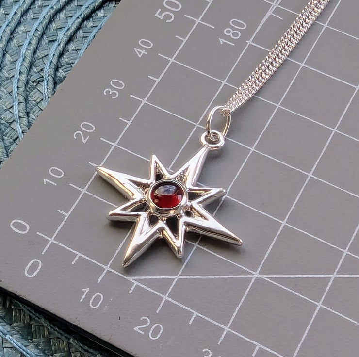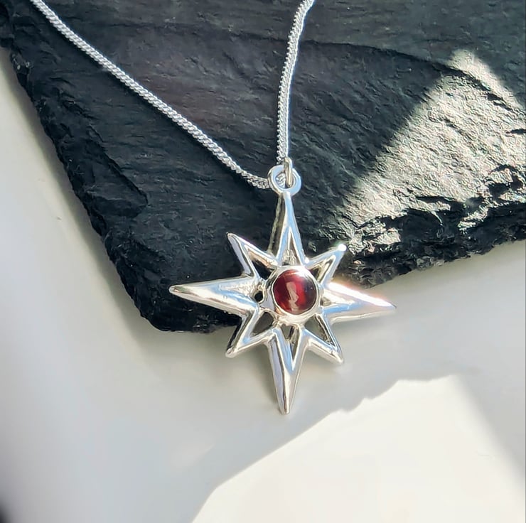 A cast sterling silver north star pendant set with a 6 mm cabochon cut garnet in a secure bezel set (if you would like different gemstone please contact me.