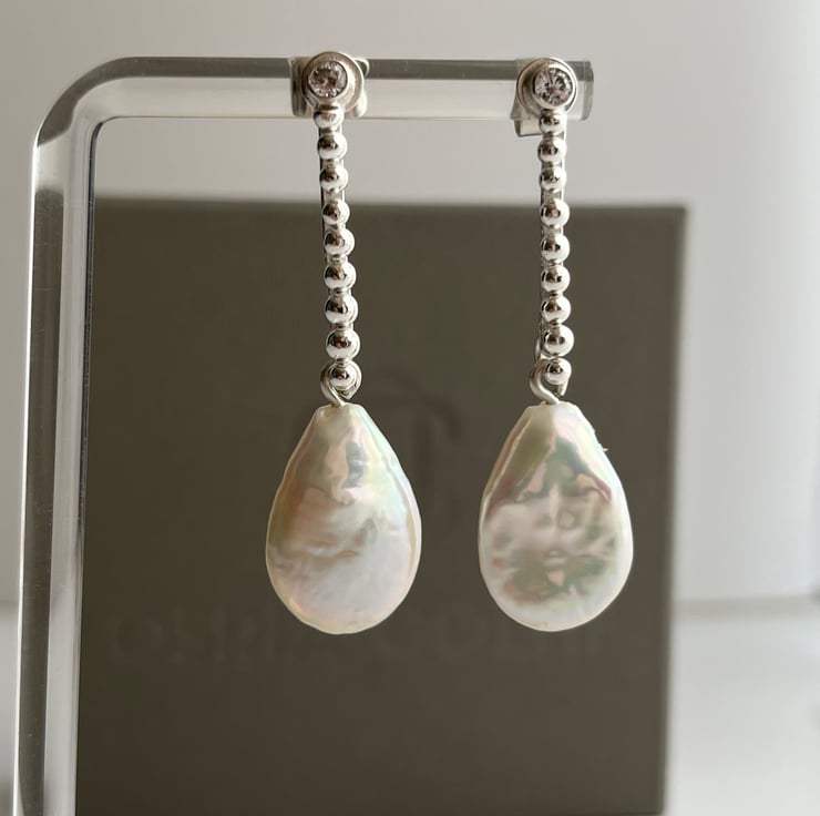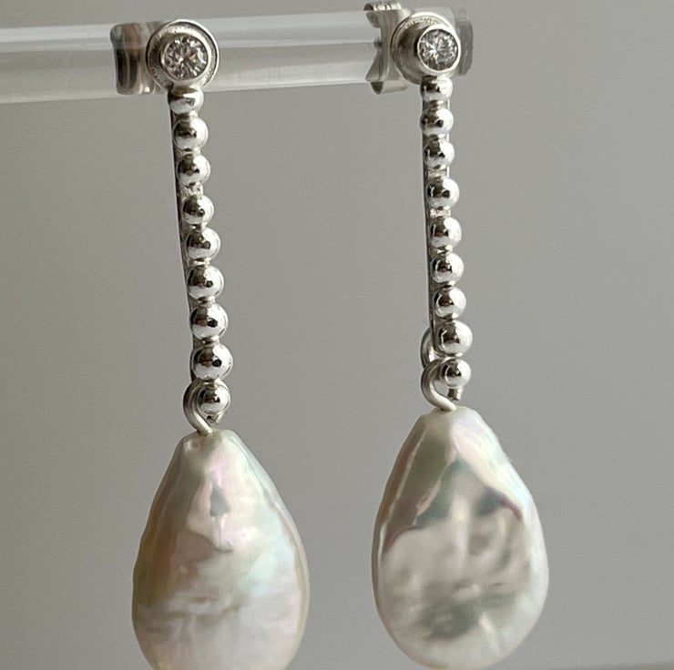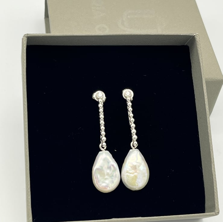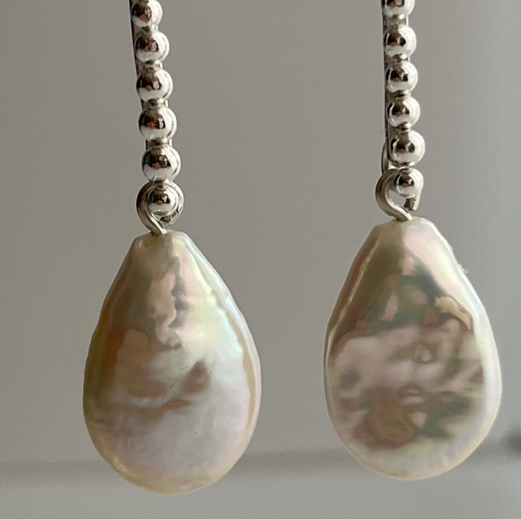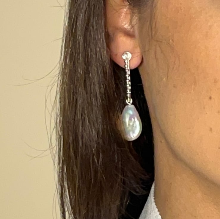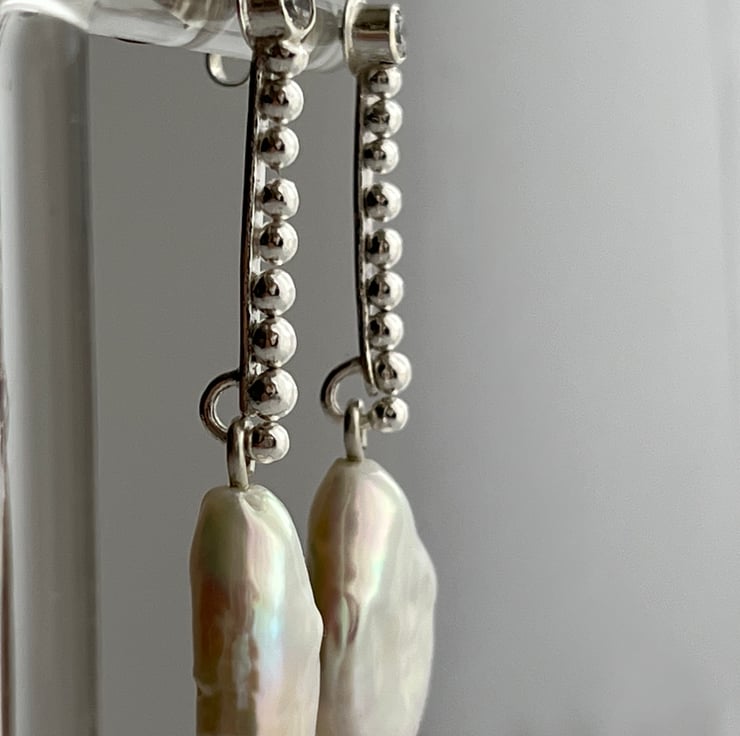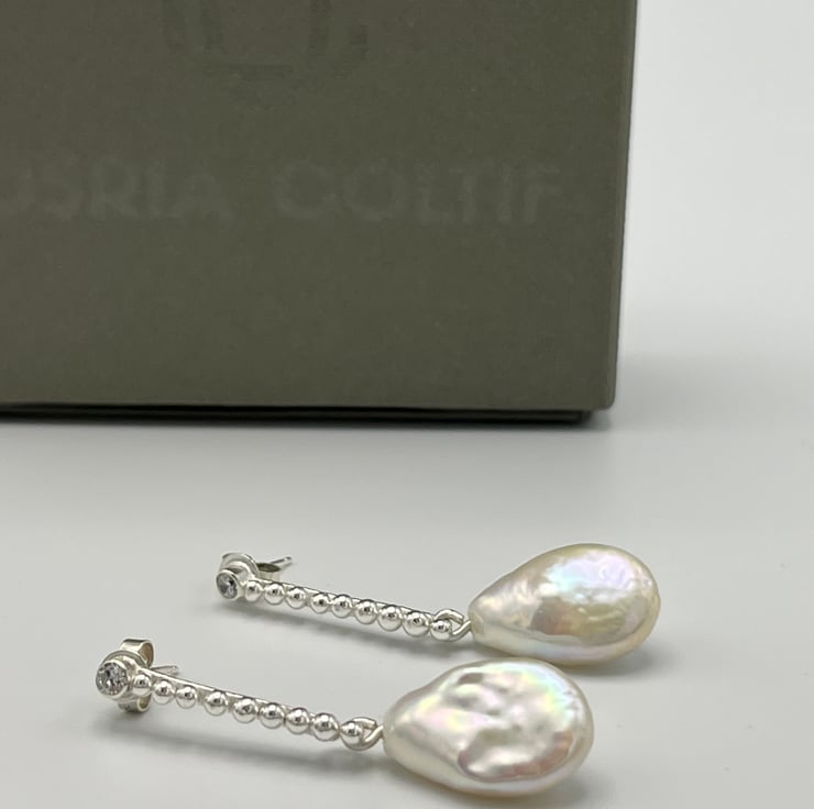 These lovely earrings celebrate the natural beauty of baroque pearls with a modern twist, all thanks to the shiny sterling silver. The beautiful baroque pearl drop earrings on a lovely granulated bar will elevate your style to new heights. Whenever a freshwater pearl catches the light, its distinctive iridescence swirls, creating a lovely soft glow. They are a lovely choice for formal occasions, weddings, or everyday wear because of their lightweight design, ensuring comfort all day long.