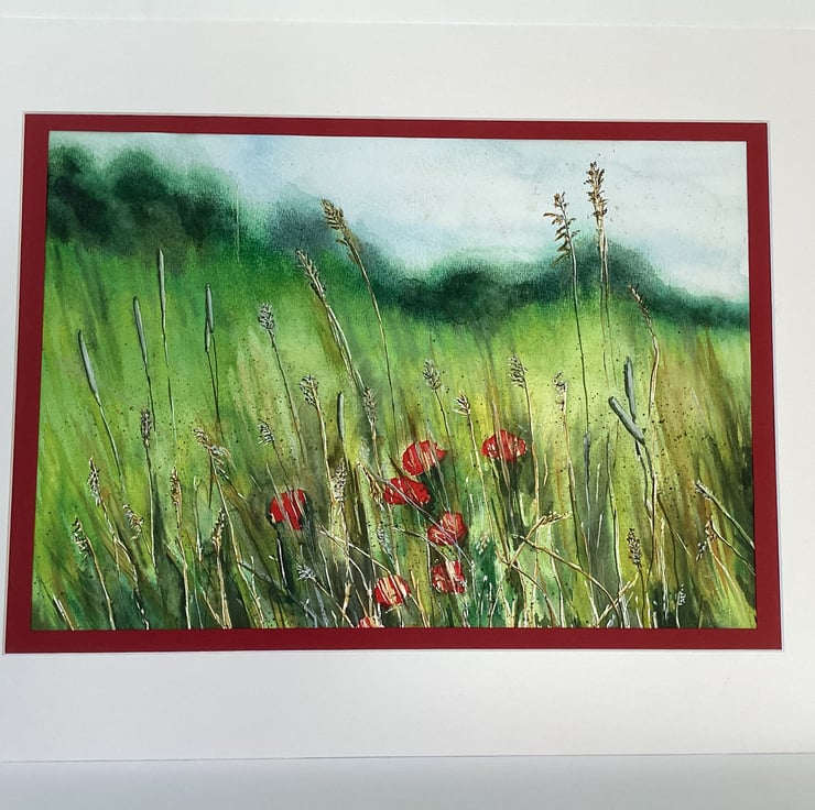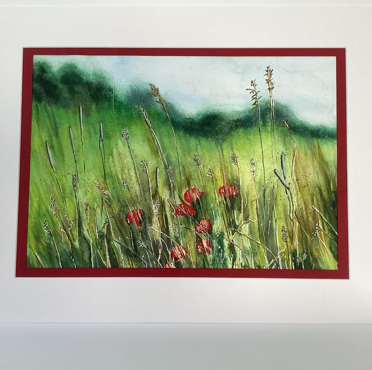 Hand painted in watercolour. Imaginary landscape of a field of wild grasses and poppies. Beautiful imagery to add to any home decor.