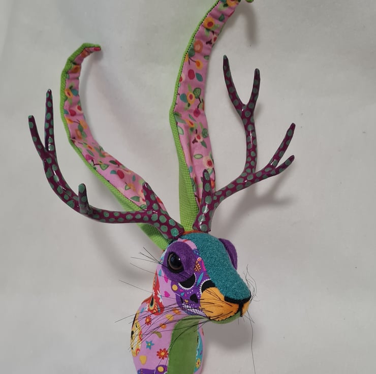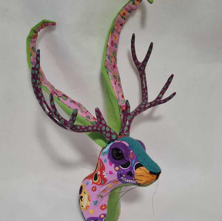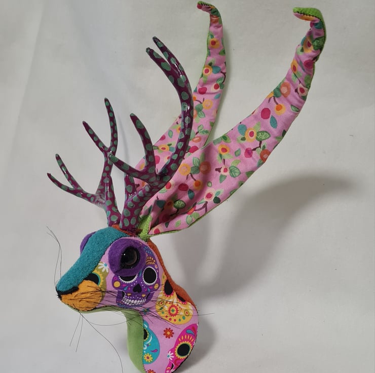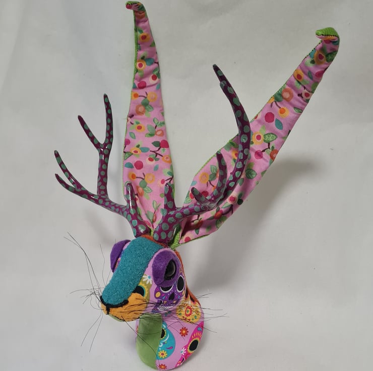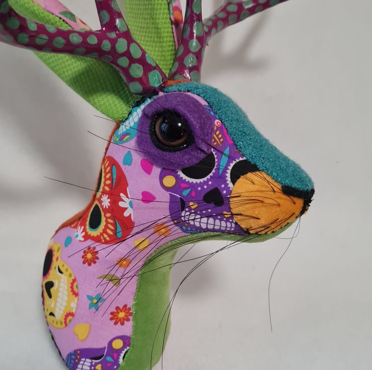 A lifesize faux jackalope (mythical hare with antlers) which I have handmade and covered in hand stitched Day of the dead skull fabric, upholstery fabric and velvet. The jackalope has hand painted antlers, giving a nod to the Mexican tradition of hand painted Alebrijes from Oaxaca.