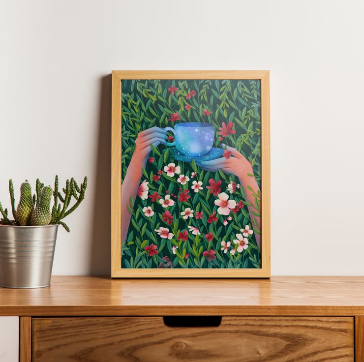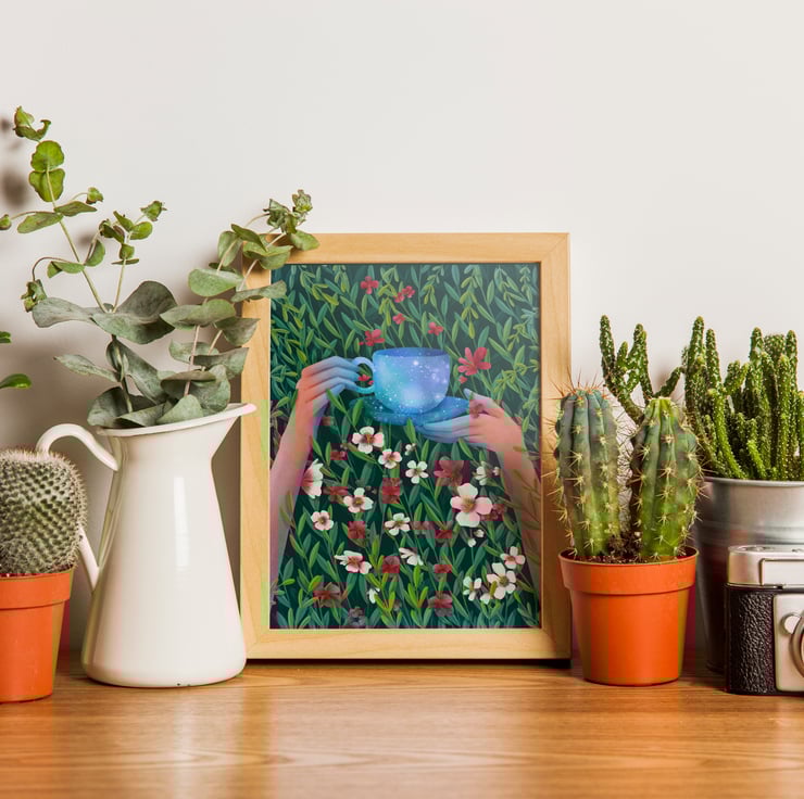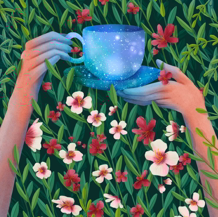 'Cup of Universe' is an illustration that captures the serene moment when you can pause, unwind, and savor your favorite hot drink—ideally with a peaceful view of nature’s beauty.
