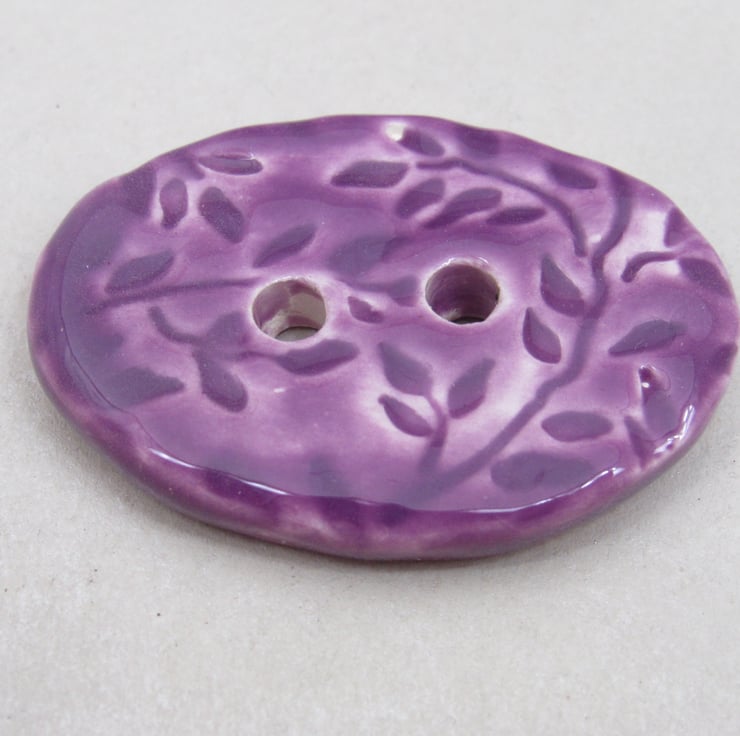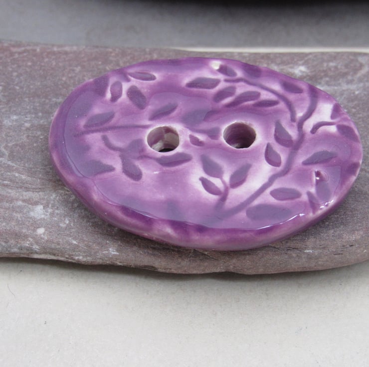 Medium oval shaped stoneware button, textured with a pretty motif of tiny leaves. Finished with a pretty lilac purple glaze.