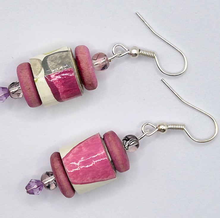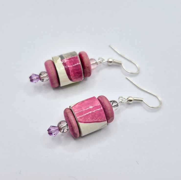 Colourful earrings made of pink, cream and grey repurposed wallpaper.