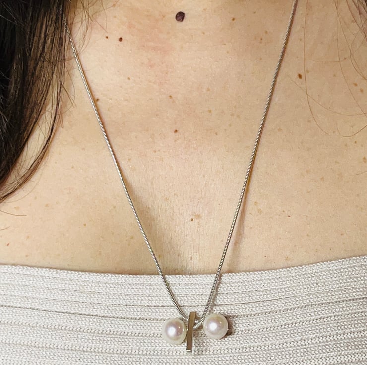 Unlike traditional necklaces, this piece has no clasp—simply pull the chain through the bar to achieve your desired length. The graceful pearl accents at each end add a subtle touch of elegance, making it perfect for both everyday wear and special occasions.