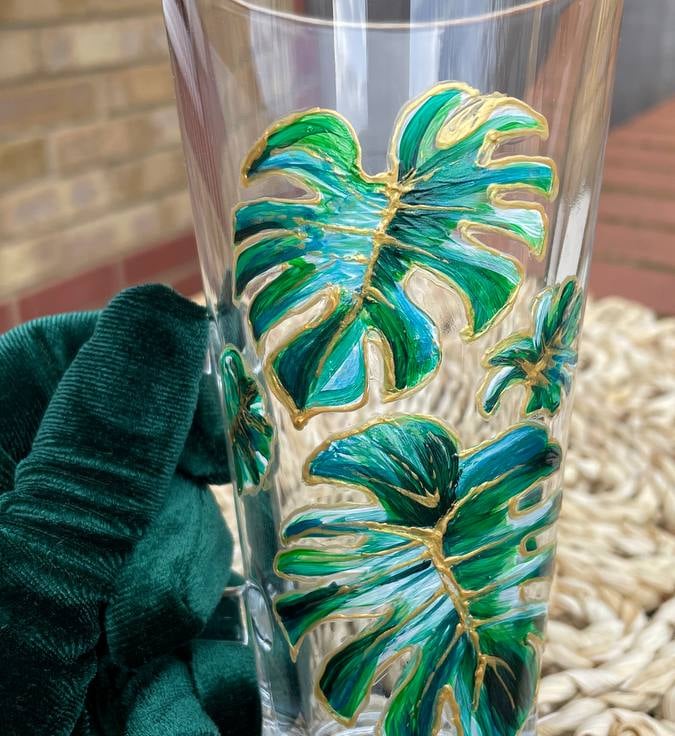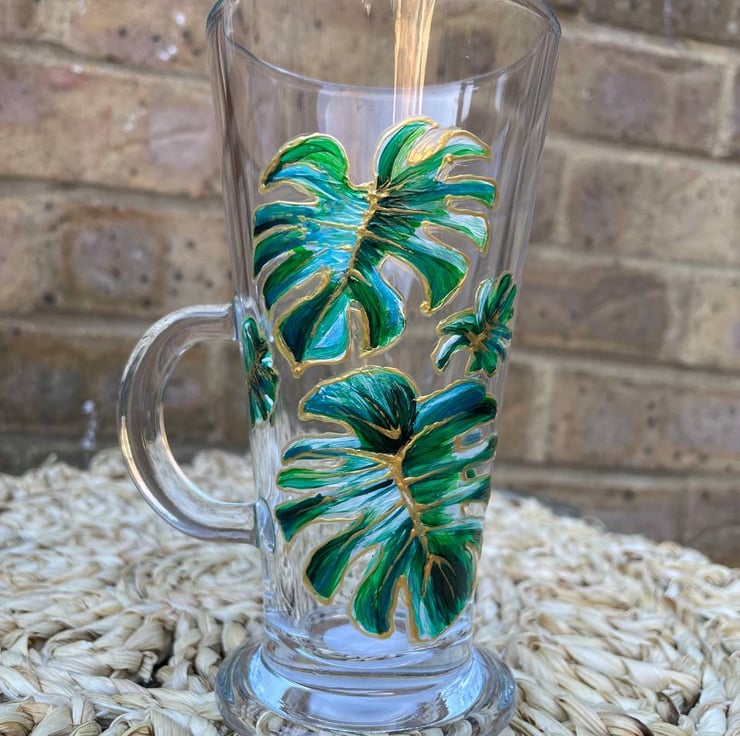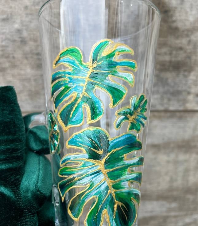 Bring a touch of nature to your daily routine with this hand-painted glass mug featuring a stunning monstera leaf design.