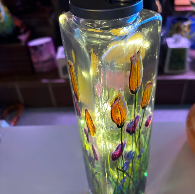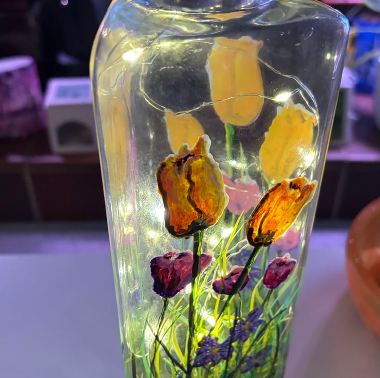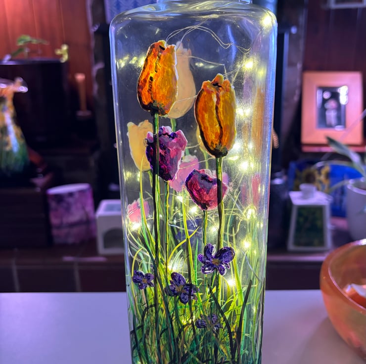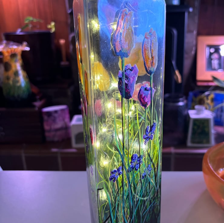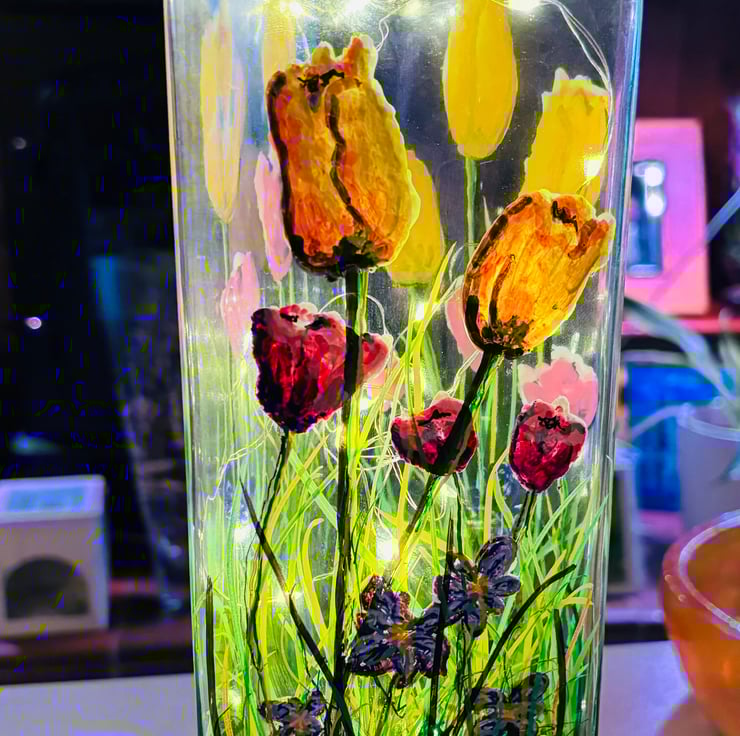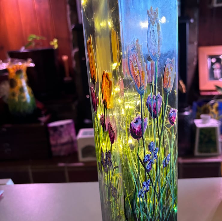 A hand painted and fired triangular spring glass vase by Andrew Jenkins