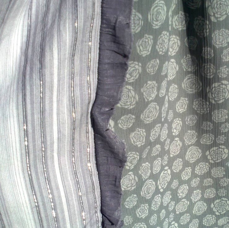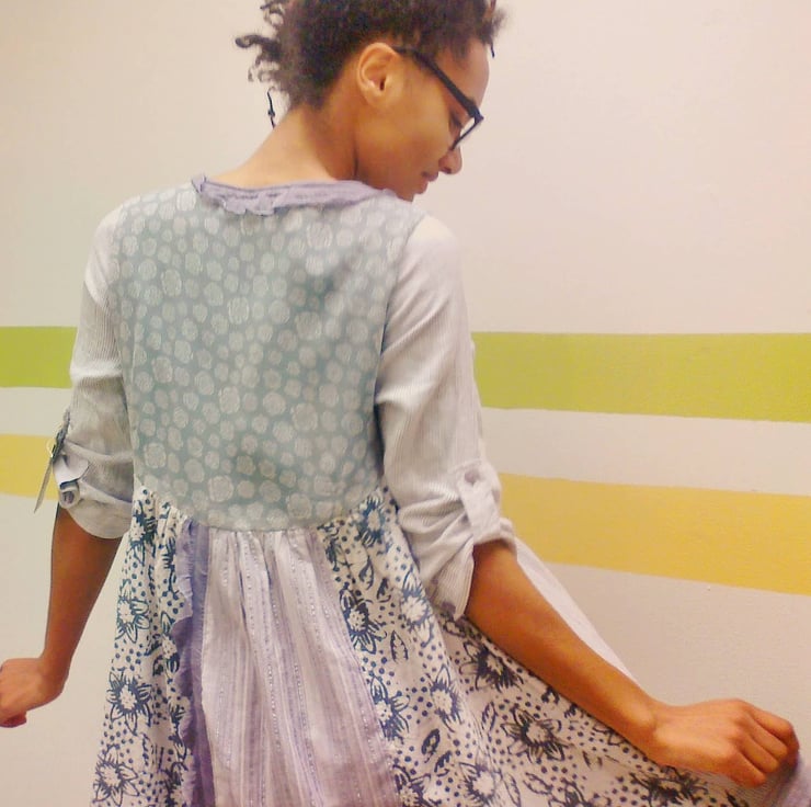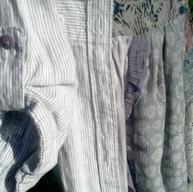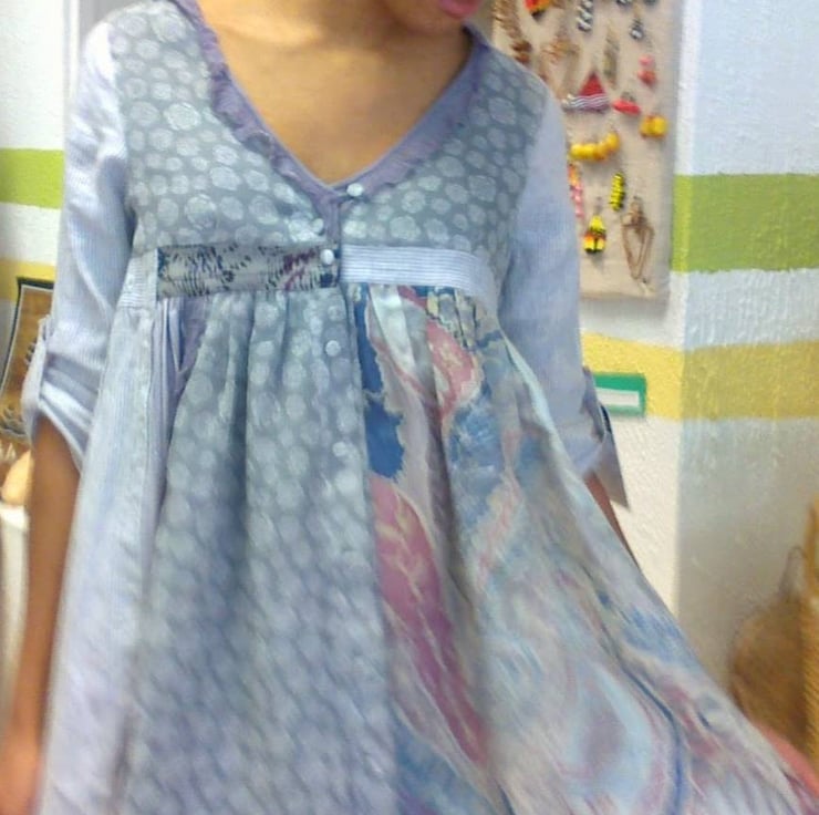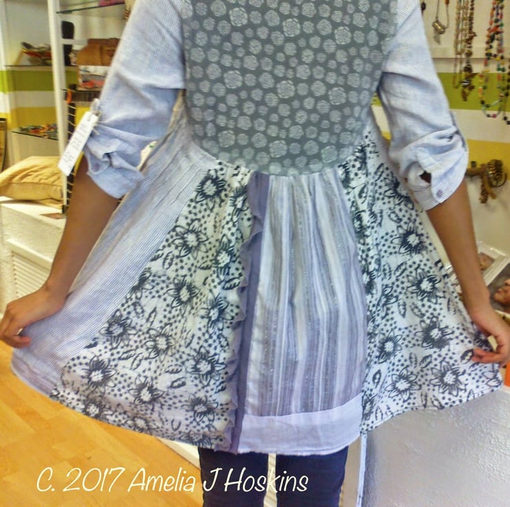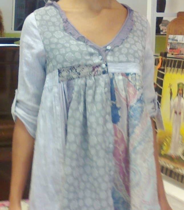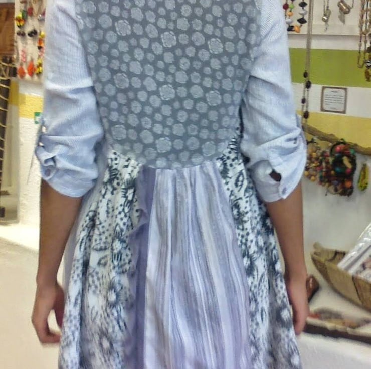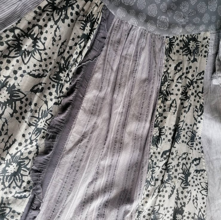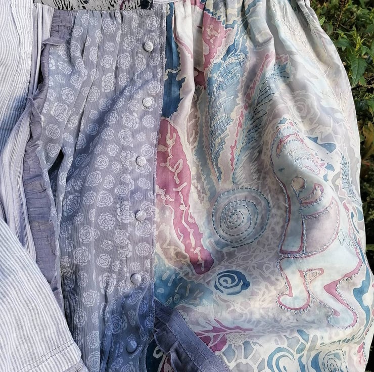 Inspiration was my Silk Painting 'Kokopelli' which turned out paler after steaming. It coordinated well with a thin polyester grey print, so the two became the dress front. Tabbed sleeves taken from lilac/white striped linen shirt dress. Grey lilac prints coordinated well.