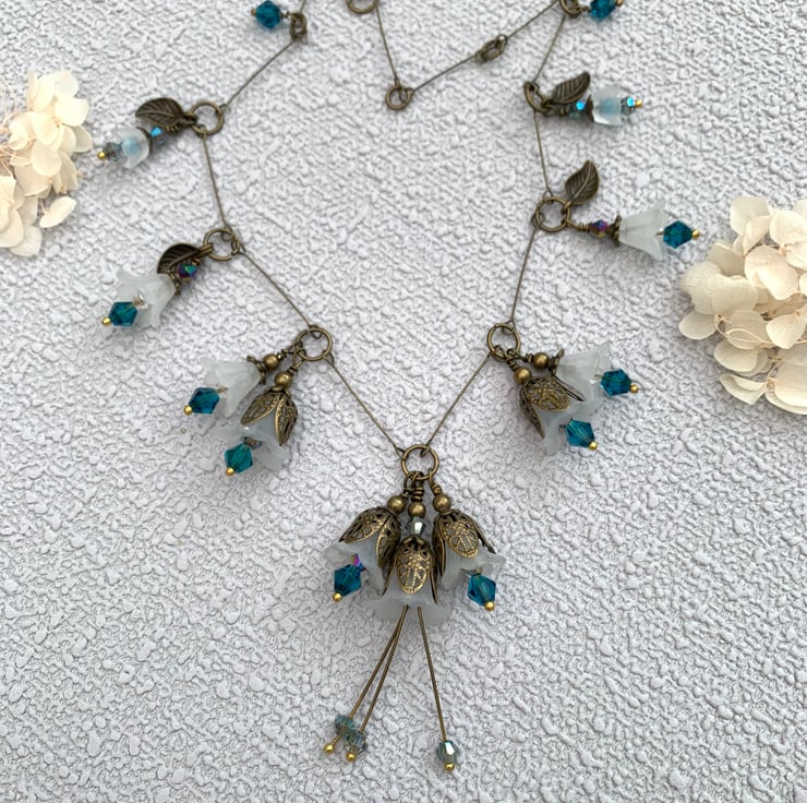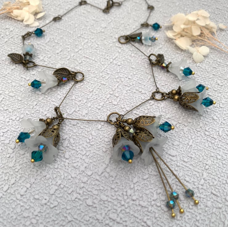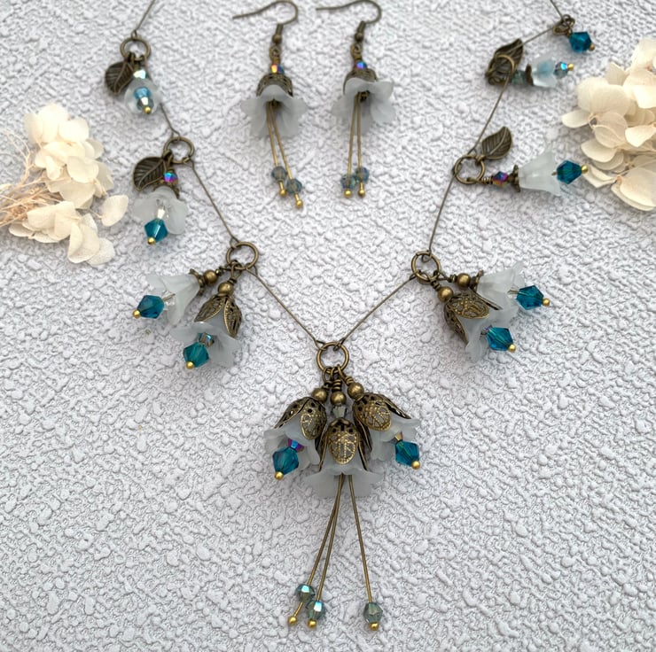 This really pretty necklace and earrings set is made in an Art Nouveau style. The set comprises white lucite flower beads with antique bronze filigree bead caps and blue glass crystal drop beads . The necklace also includes tiny antique bronze leaf charms and the main central feature flower has long flower stamens that move with the necklace. The chain part is made of bronze effect links and is finished with a lobster fastening. The set is completed with a pair of matching earrings.