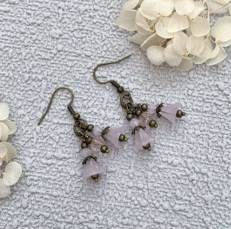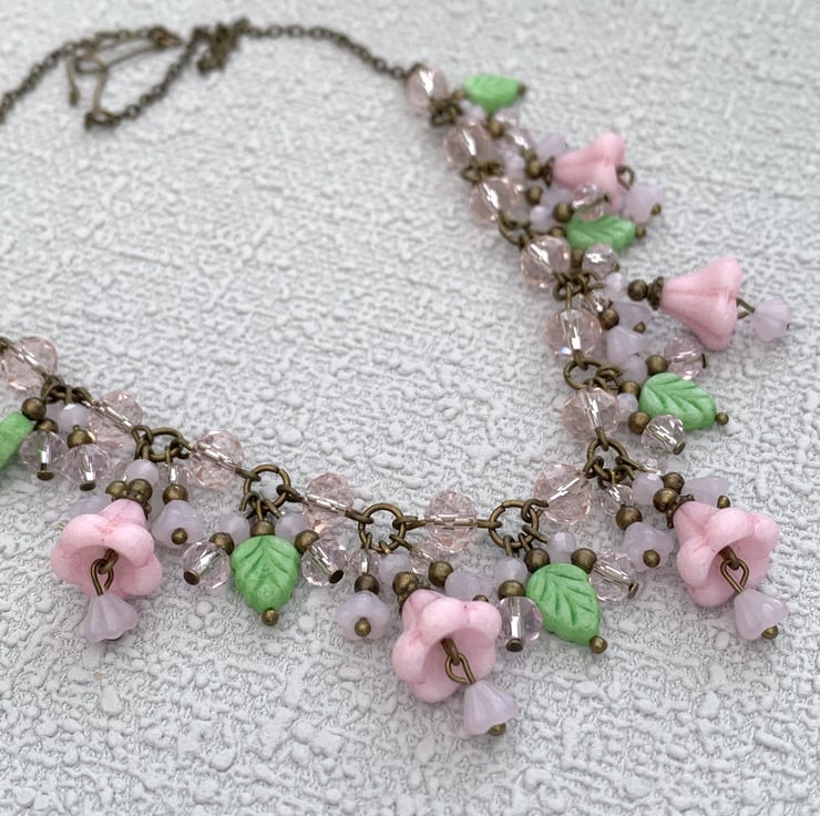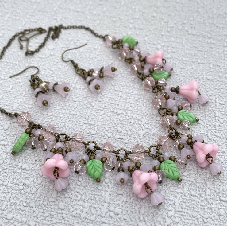 This charming jewellery set is made with a collection of pretty Czech glass flower beads in two shades of pink. Each flower bead has tiny glass flower beads and topped with small bronze beads. The necklace also includes small green glass leaf beads.